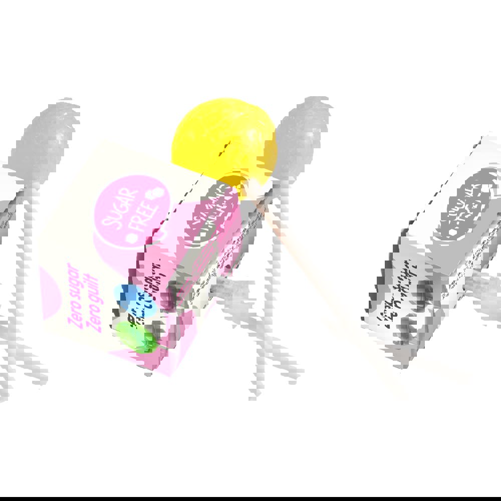 Suikervrije Lolly van ca. 10 gram in een vierkant doosje, voorzien van een all-over full colour bedrukking. De lolly's worden in een mix van diverse standaard fruitsmaken geleverd