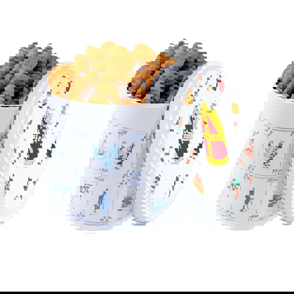 Delftsblauw blik gevuld met ca. 350 gram Engels drop en voorzien van een full colour digitale bedrukking op het deksel