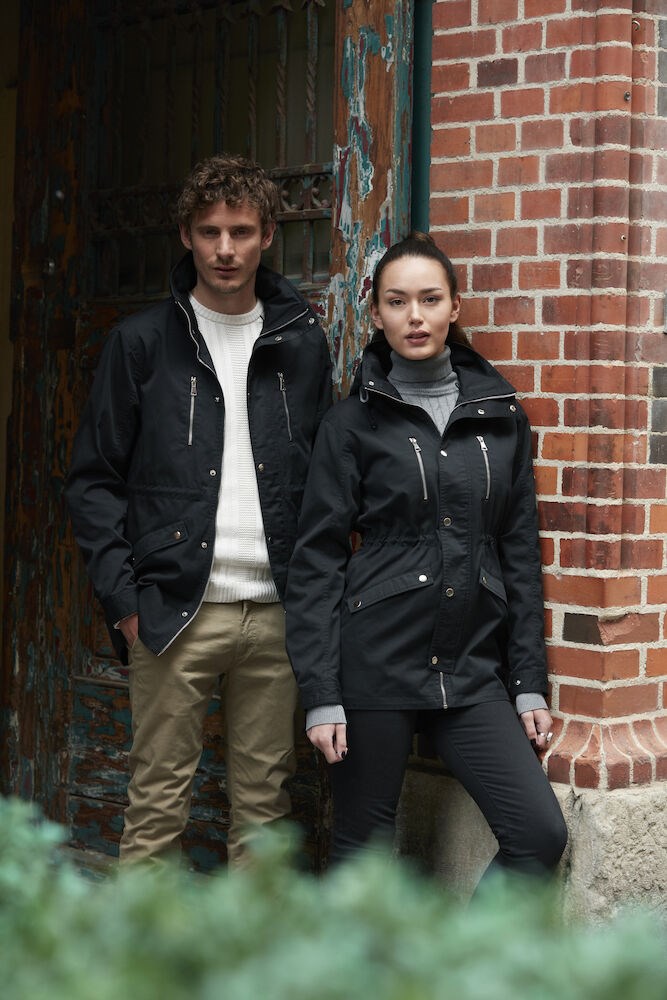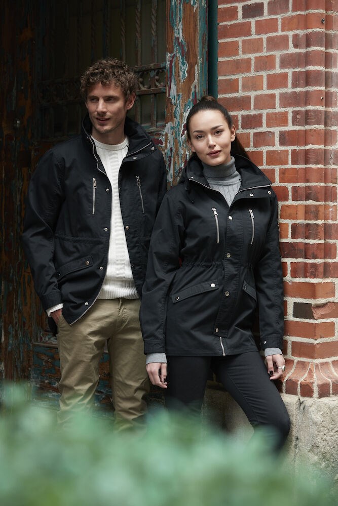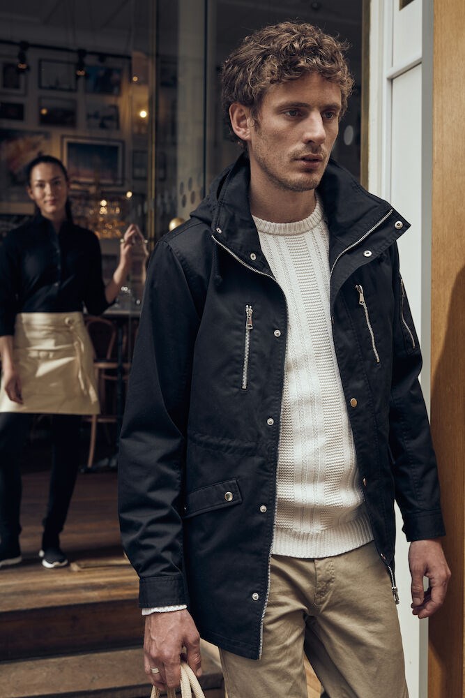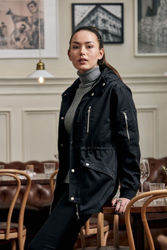 Luchtige jas met dunne voering en eigentijdse uitstraling door de afwerking met metalen ritsen en drukknopen. De jas is voorzien van een capuchon die kan worden weggestopt in de kraag. De zakken op de borst, voorzijde, mouw en aan de binnenzijde zorgen voor voldoende opbergruimte. De jas is gemakkelijk te veredelen dankzij de drukkersrits aan de binnenzijde. Kortom, de ideale tussenjas.
