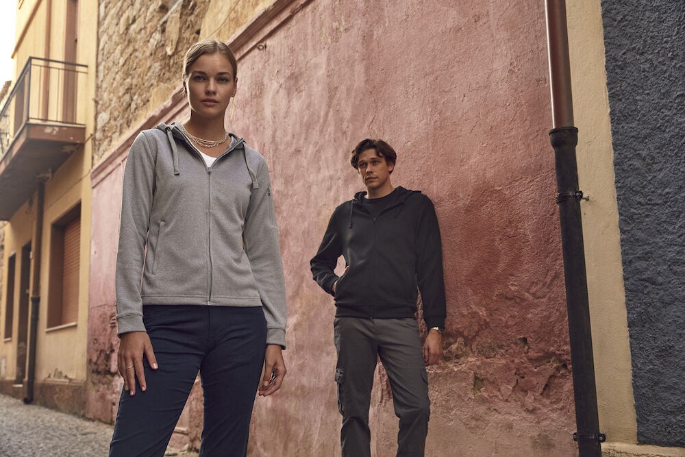 Modern vest met capuchon voorzien van doorvoer voor een koptelefoon, ton sur ton rits, twee zakken met rits en een zak met rits op de mouw. De sweater is ingeverfd door middel van Spun Dyed. Het trekkoord in de capuchon, de rib in de boord (heren model) en onderaan de mouwen en de visgraat necktape geven de sweater een verzorgde uitstraling. De sterke prijs-/kwaliteitverhouding maakt van deze sweater een gegarandeerde bestseller.