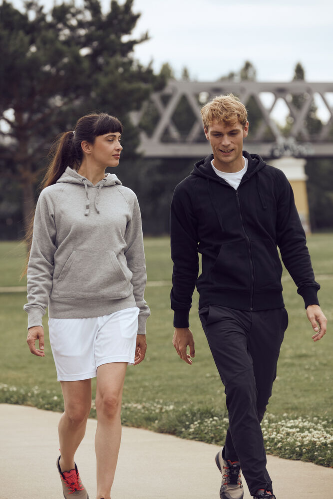 Moderne trui met capuchon en raglan mouwen voor een eigentijdse uitstraling. De trui is voorzien van rib in de zijpanelen en boorden. Verder heeft de trui een buidelzak, handige oplossing voor een koptelefoon en een verborgen zak. De trui is professioneel afgewerkt met visgraat necktape en metalen oog voor het trekkoord. De behandelingen met softener en enzymen zorgen ervoor dat de trui zacht en glad aanvoelt.