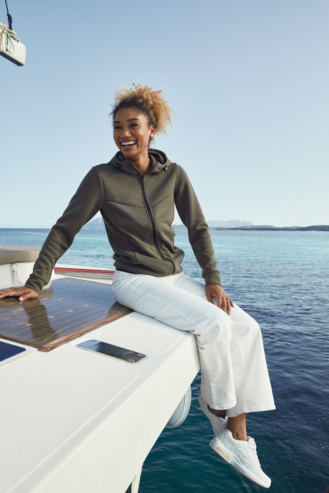 Een jack van zacht aanvoelende air-layer stof met capuchon. De luchtlaag tussen de 2-laagse stof biedt extra warmte terwijl het licht aanvoelt. Het polyester in deze stof is van gerecycled materiaal. Voorzien van twee verborgen zijzakken met rits, twee binnenzakken, manchetten van shellstof en elastische tape in de boord. De capuchon is te verstellen met het trekkoord en het jack heeft een gemakkelijk te verwijderen label voor rebranding.