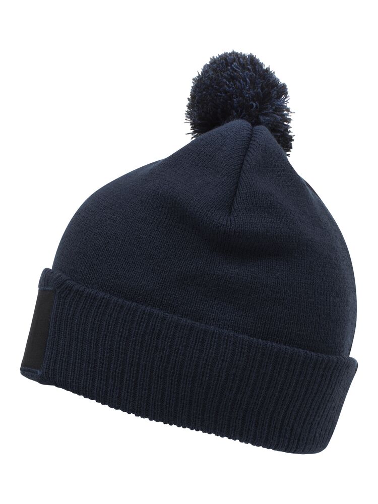 Klassieke gebreide beanie met omgeslagen boord, twee kleurige pompon en een patch van katoenen twill.