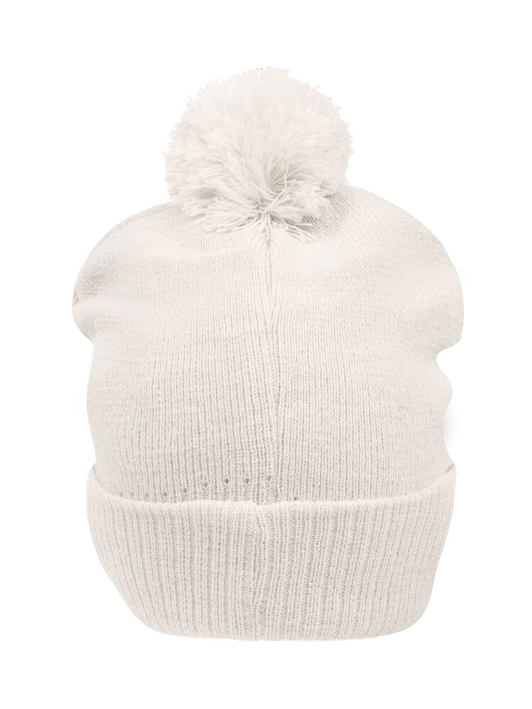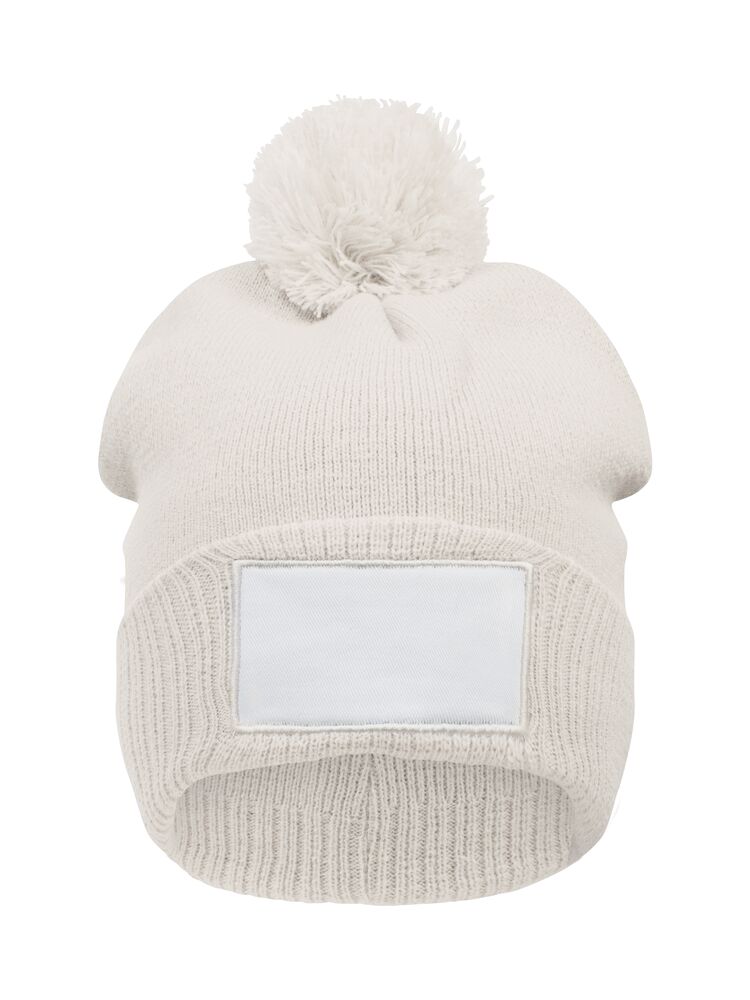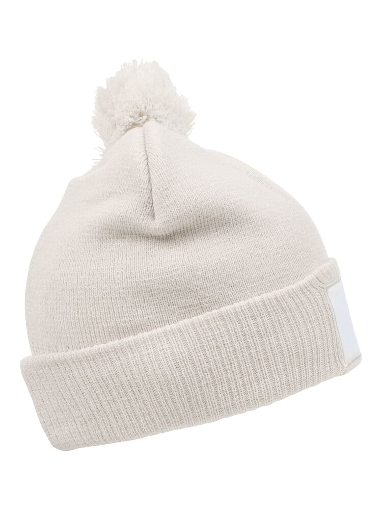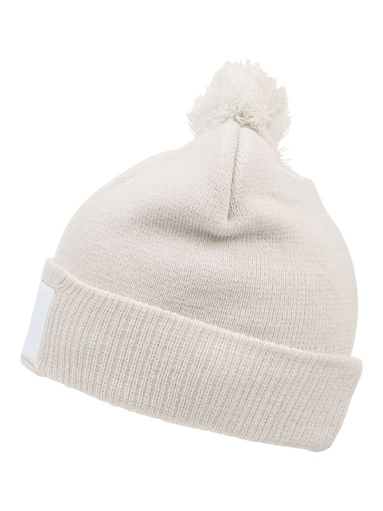 Klassieke gebreide beanie met omgeslagen boord, twee kleurige pompon en een patch van katoenen twill.
