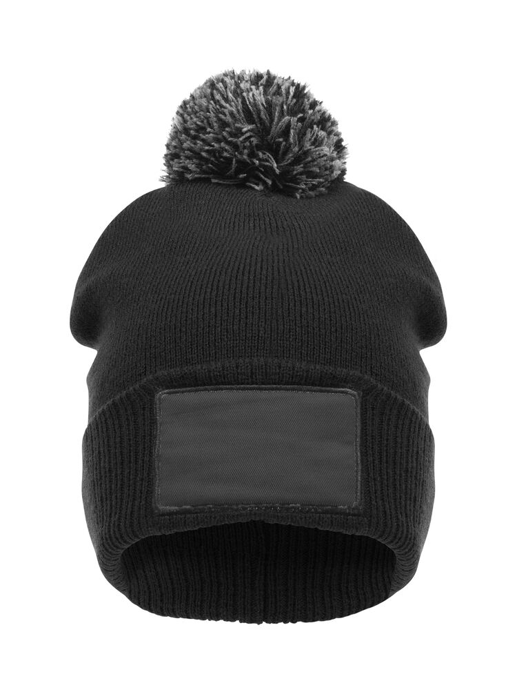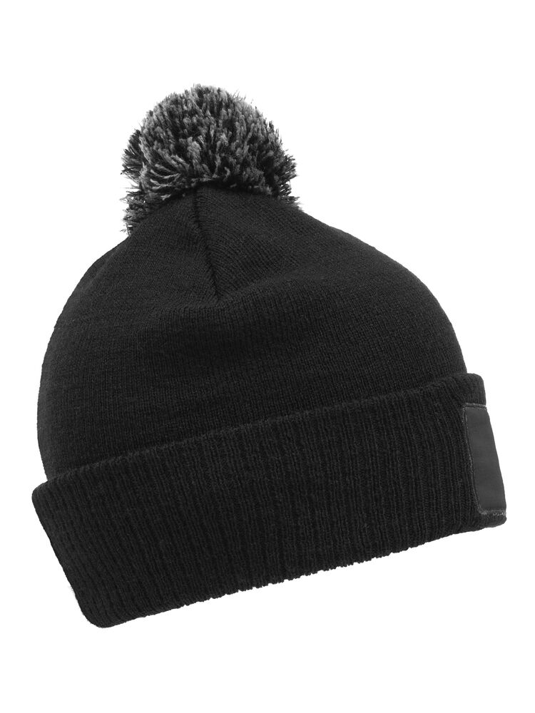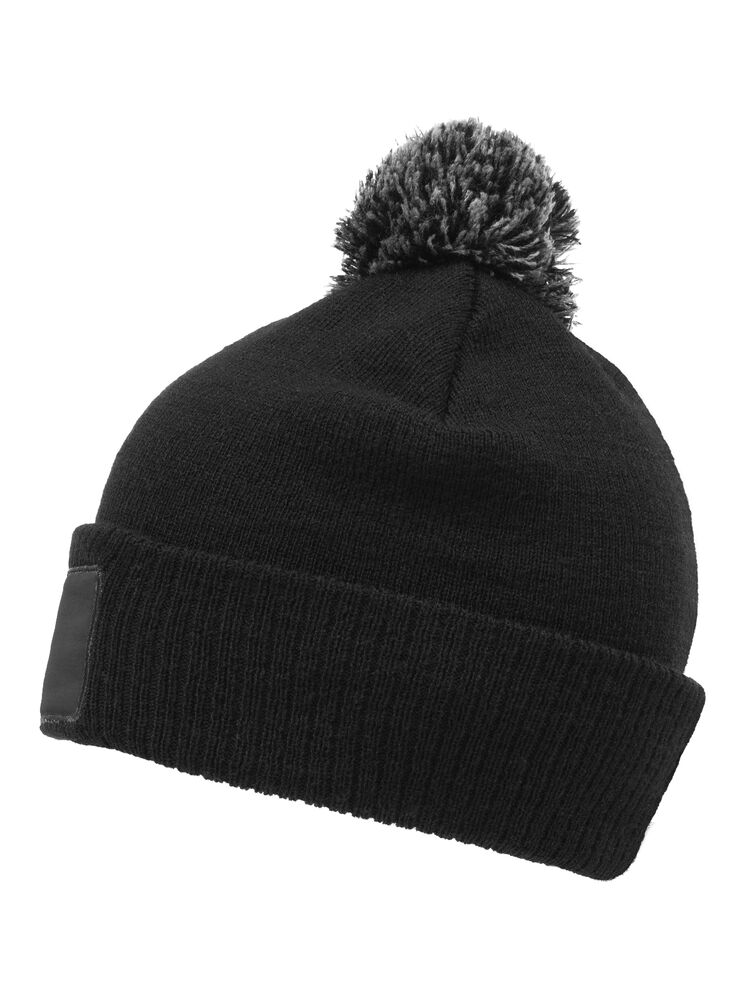 Klassieke gebreide beanie met omgeslagen boord, twee kleurige pompon en een patch van katoenen twill.
