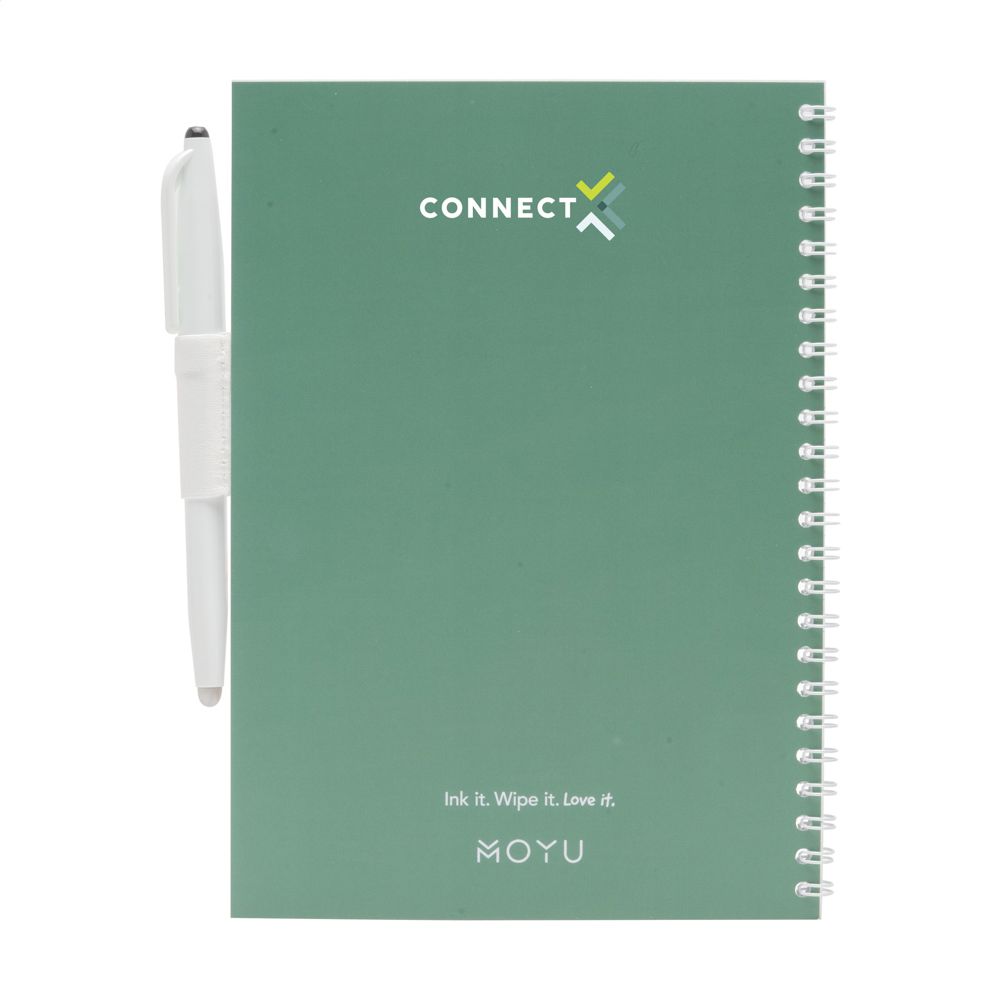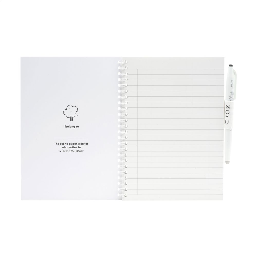 Uitwisbaar A5-notitieboek van steenpapier van het merk MOYU. Met buigzame 400 grams softcover. Inclusief pen en schoonmaakdoekje. Iedere steenpapieren pagina is van nature boomvrij en 100% recyclebaar. Dit notitieboek met elastische pennenlus, is gebonden in een sterke wire-o-binding en telt 18 pagina's gelinieerd papier. Maak je notities met de bijbehorende, speciale MOYU pen. De pen bevat de originele Frixion inkt. De inkt droogt volledig op steenpapier en is gemakkelijk uit te wissen zonder sporen achter te laten. Maak het meegeleverde MOYU doekje een beetje vochtig met wat water en wis de inkt uit. Zo blijven pagina's leeg voor nieuwe ideeën en to-do-lijstjes. Je kunt gemiddeld zo'n 500 keer op steenpapier schrijven. Dit notitieboek gaat jarenlang mee. Steenpapier is gemaakt van 80% kalksteen en 20% schone kunststof. Het is van nature vrij van bomen, en er zijn geen water en chemicaliën nodig om het te maken. De productie van steenpapier is daarom zuiniger en er is 67% minder CO2-uitstoot dan de bij productie van pulp papier. Bovendien is steenpapier eindeloos te recyclen, zonder nieuwe grondstoffen toe te hoeven voegen.