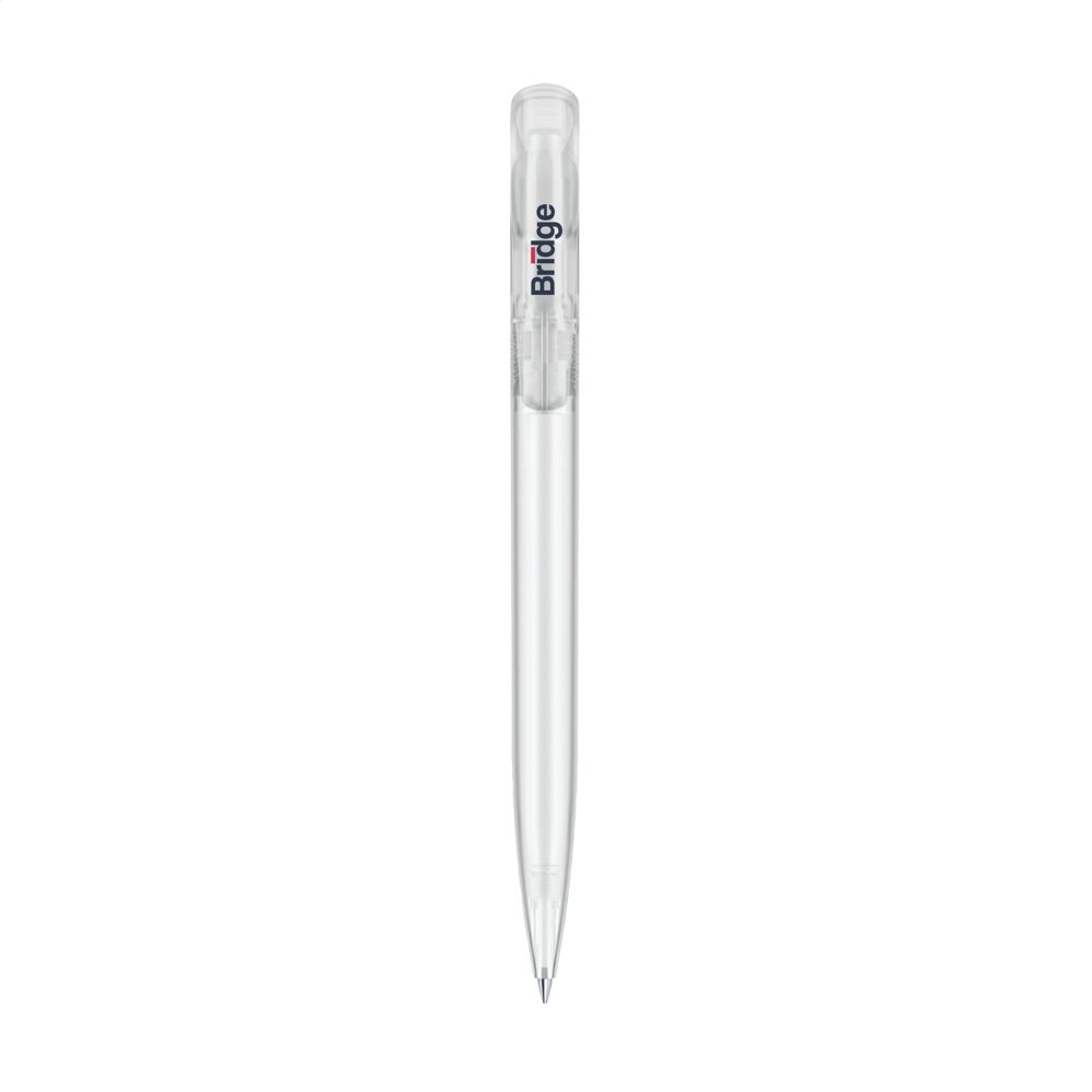 Blauwschrijvende balpen van het merk Senator®. Met transparant gekleurde houder en royale clip/drukknop. Made in Germany.
