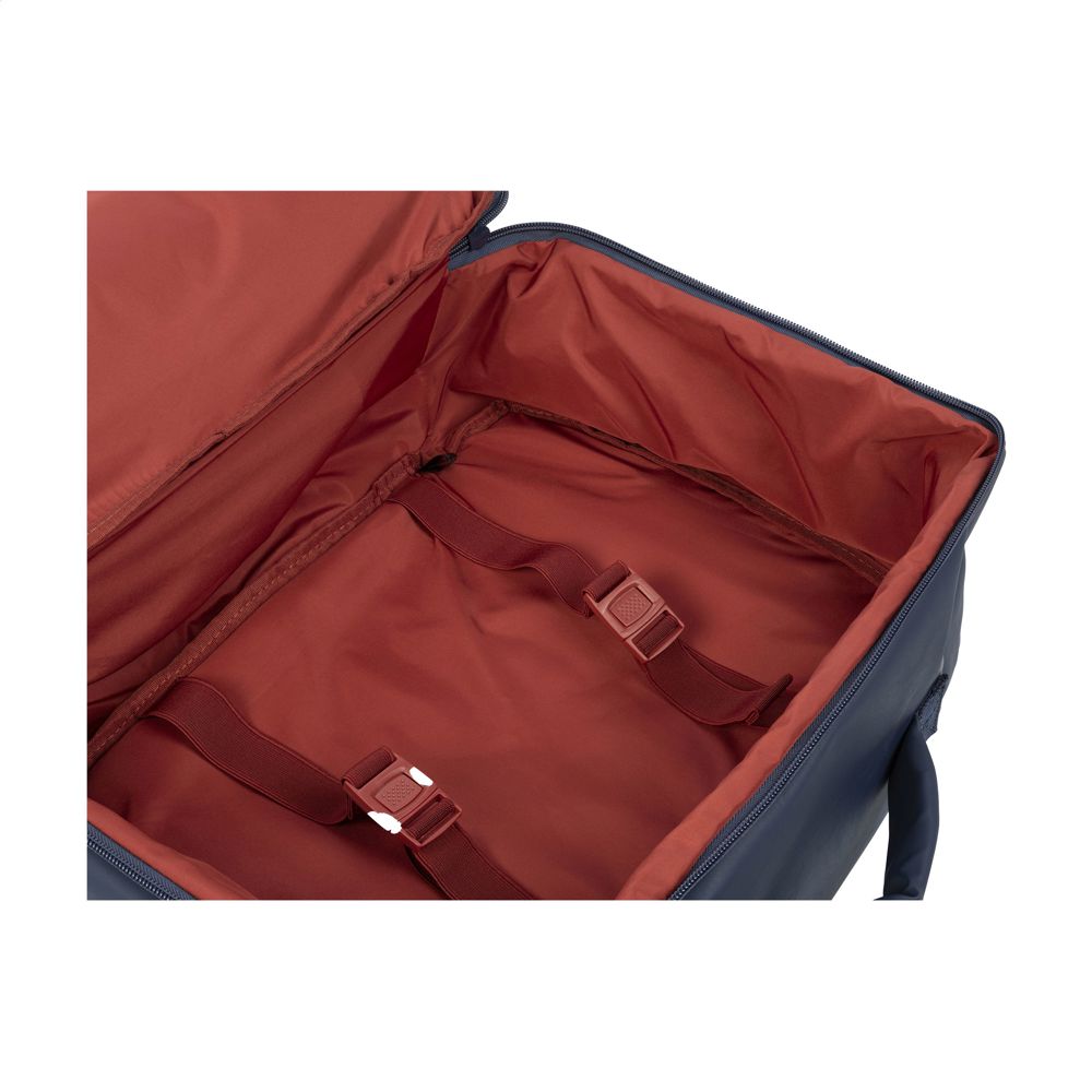 Handbagage rugzak van het Italiaanse merk Tucano. Deze rugzak voldoet aan de afmetingseisen van alle lowcost luchtvaartmaatschappijen. Gemaakt van regenbestendig, met hars gecoat materiaal dat is geproduceerd uit gerecycled kunststof, waaronder 23 gerecyclede PET-flessen. Ook de ritsen zijn bestand tegen de regen. Deze reisvriendelijke cabin-rugzak heeft een ruim binnenvak voor kleding en accessoires, een groot ritsvak aan de voorzijde en een zijvak voor een paraplu of waterfles. Met een gewatteerd vak aan de achterzijde voor het vervoeren van laptops tot 15,6 inch of een MacBook Pro 16 inch. Aan de achterkant zit een verborgen ritsvak voor het opbergen van persoonlijke documenten. De tas is volledig gevoerd. Dankzij de gewatteerde schouderbanden en de twee handgrepen, één aan de bovenkant en één aan de zijkant, is deze tas altijd gemakkelijk te dragen. Deze rugzak is ontworpen om te voldoen aan de cabineafmetingen van alle luchtvaartmaatschappijen. Past onder de stoel in het vliegtuig en is daarmee de ideale reisgenoot tijdens vliegreizen.