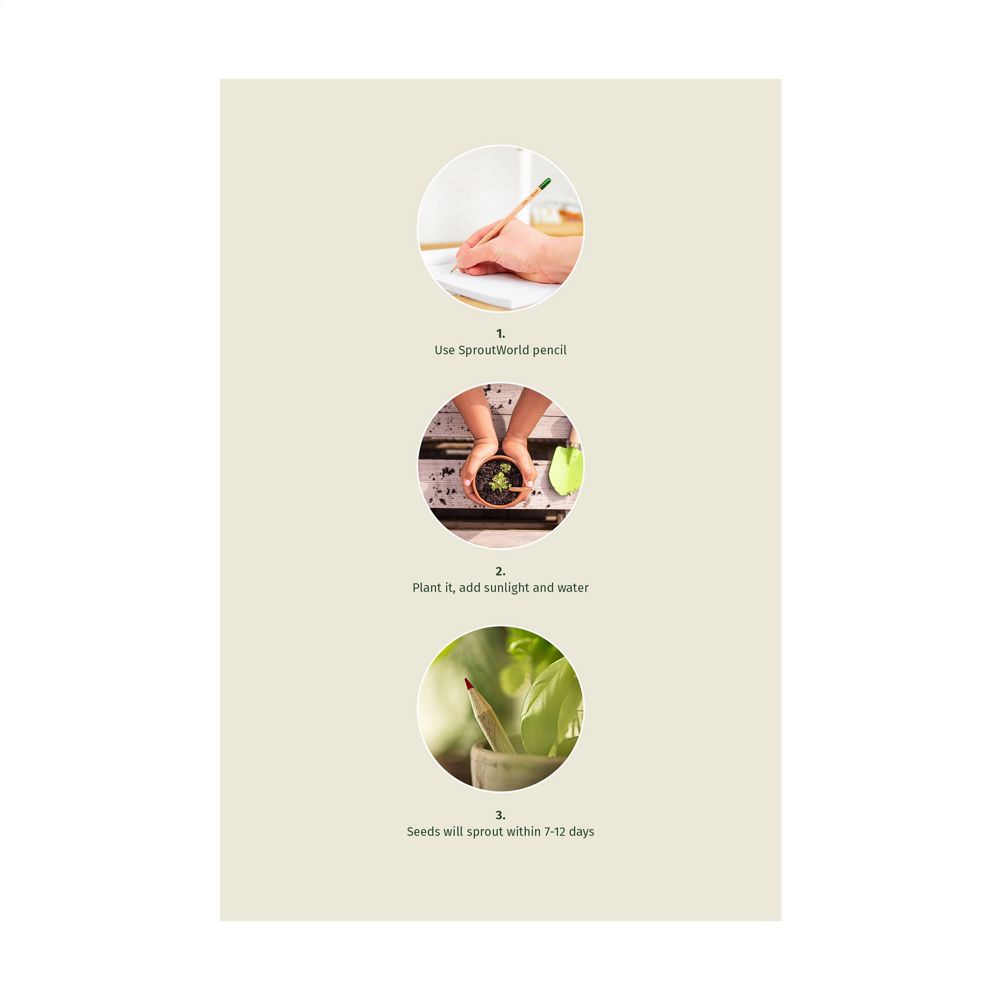 Sproutworld potlood met inspirerende boodschap voor de natuur. Dit ongeslepen potlood is gemaakt van hout. Aan het uiteinde van het potlood is een capsule (van cellulose) bevestigd waarin enkele zaadjes zitten. Zodra het potlood te klein is geworden om te gebruiken, plant je het potlood met de capsule in de aarde. Na zo'n 2-3 weken ontkiemen de zaadjes en groeien ze uit tot mooie bloemen, geurige kruiden of groenten. Keuze uit diverse soorten. De naam van de plant staat standaard in het potlood gegraveerd. Het potlood bevat geen lood en is daarom volkomen veilig. Made in Europe. Bijkomend artikel W387: Kleurrijk kaartje van karton waar het potlood ingestoken kan worden. Op de kaart staat Engelstalige informatie over het product. Deze kaart geeft het product een exclusieve attentiewaarde. Een Life Cycle Assessment (LCA) van dit product is beschikbaar bij de downloads.