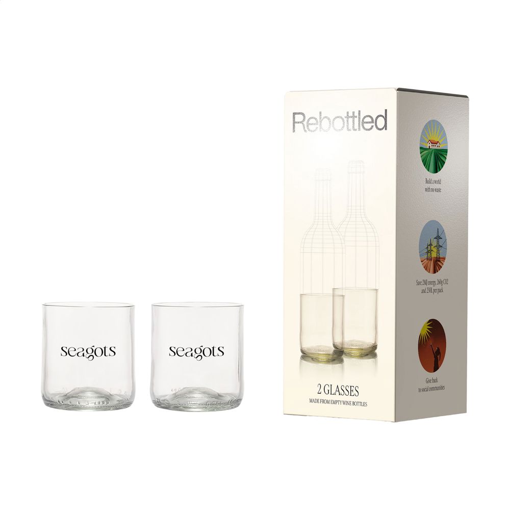 Set Rebottled® design drinkglazen gemaakt van geupcyclede wijnflessen. Unieke glazen waarin je direct de oorspronkelijke wijnfles herkent. De glazen liggen lekker in de hand en hebben een gladde afwerking. Van hoge kwaliteit en geschikt voor water, sap of wijn. Vaatwasserbestendig tot 60C°. Voor behoud van de opdruk wordt met de hand afwassen aanbevolen. De glazen worden per set geleverd in een originele geschenkverpakking van gerecycled karton. Dutch design. Made in Holland. Inhoud ca. 250 ml per glas. Bedrukking alleen mogelijk in de kleur zwart of wit. Rebottled® upcyclet lege wijnflessen tot 100% circulaire design items. Per set verpakt.