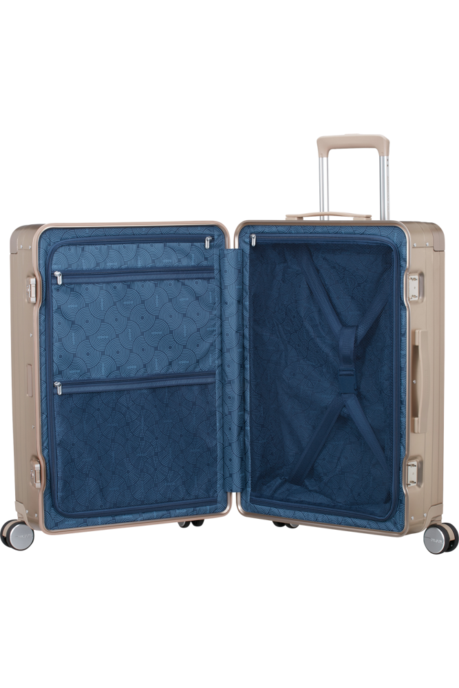 De SoundBox Alu collectie combineert een opvallend design met premium stevigheid. De kenmerkende geribbelde structuur en het doossilhouet zijn opvallend, terwijl de aluminium behuizing zowel elegantie als duurzaamheid biedt. Verkrijgbaar in drie maten, elk stuk heeft twee TSA-sloten met één druk op de knop en soepele dubbele wielen met 3 kogellagers voor moeiteloos rollen. Perfect voor reizigers die hun koffer er zowel scherp als van topkwaliteit uit willen laten zien.