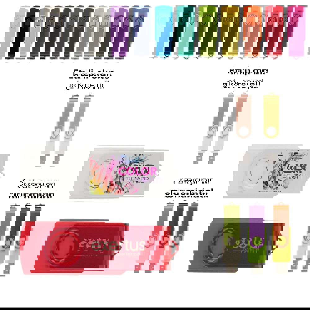 Populaire USB 2.0 flash drive met aluminium draaigedeelte en 8GB geheugen. Zowel de body als het aluminium draaigedeelte zijn in twaalf kleuren uit voorraad leverbaar en onderling uitwisselbaar. Prijzen zijn exclusief de wettelijk verplichte €0,50 thuiskopieheffing.