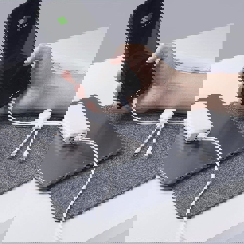 Duurzame oplaadset, kabel en powerbank zijn gemaakt met gerecycled plastic. De 7000 mAh powerbank kan uw telefoon tot 2,5 keer opladen. multi-oplaadkabel met USB, Lightning, Type C, Micro USB.