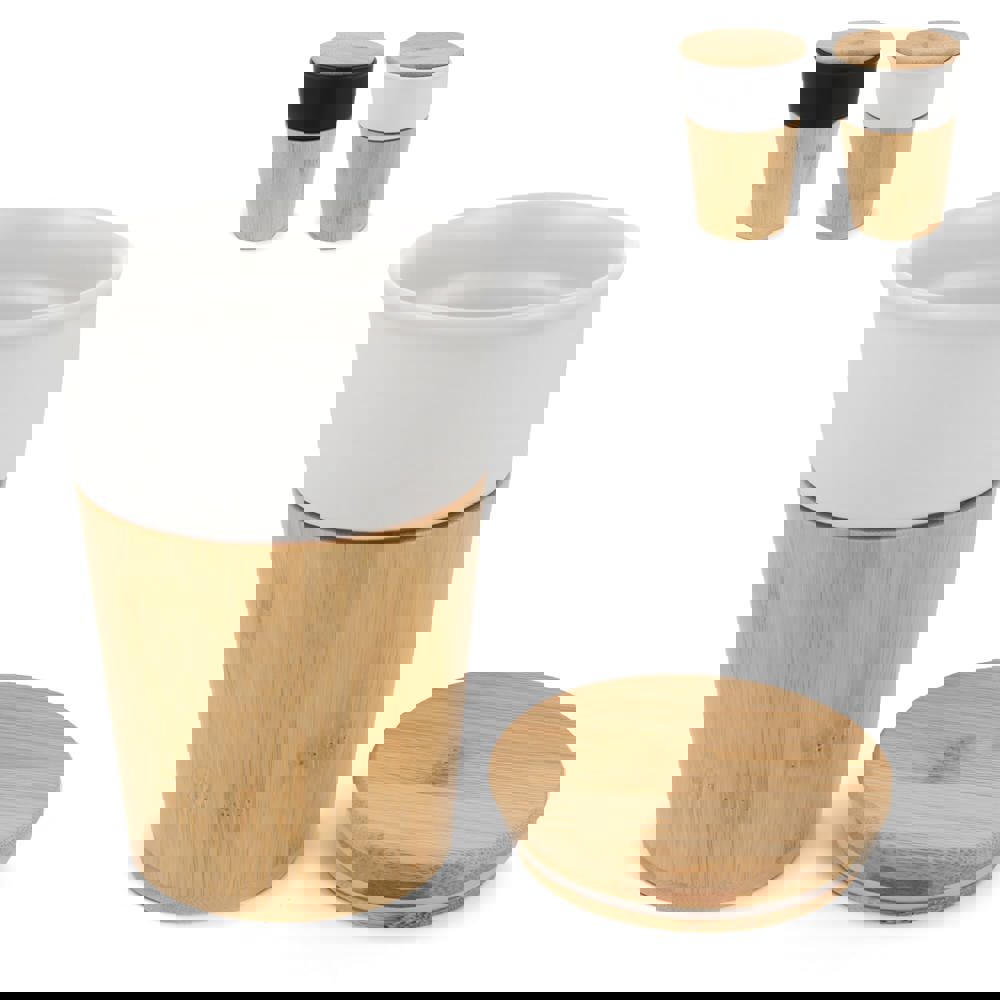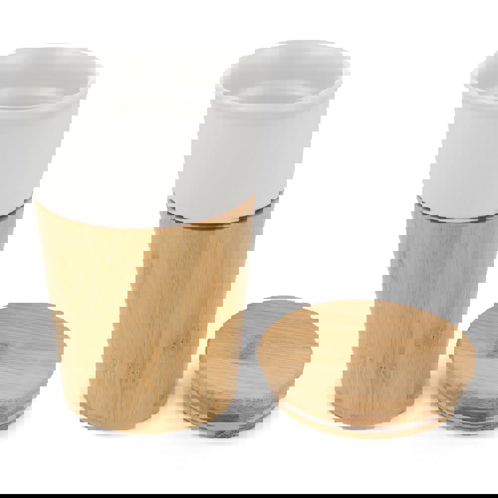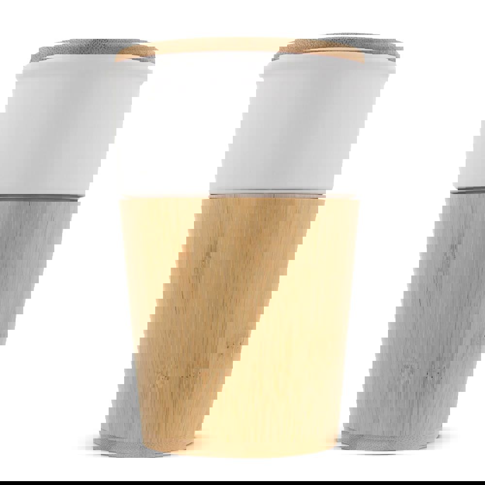 Maak kennis met onze keramische mok met bamboe buitenzijde en deksel; een vleugje natuurlijke elegantie bij elke slok.
