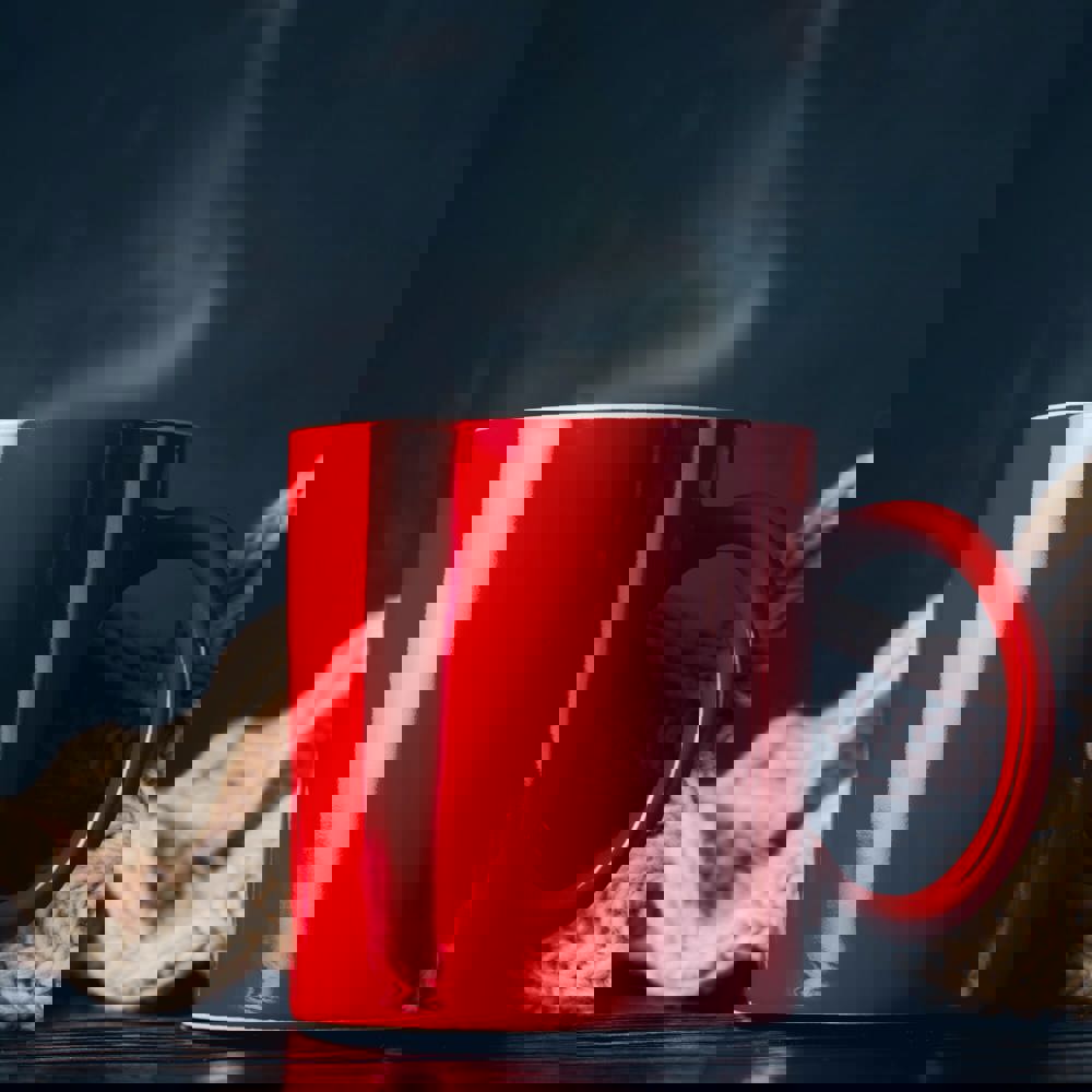 Helderrode aardewerken mok met witte binnenzijde.