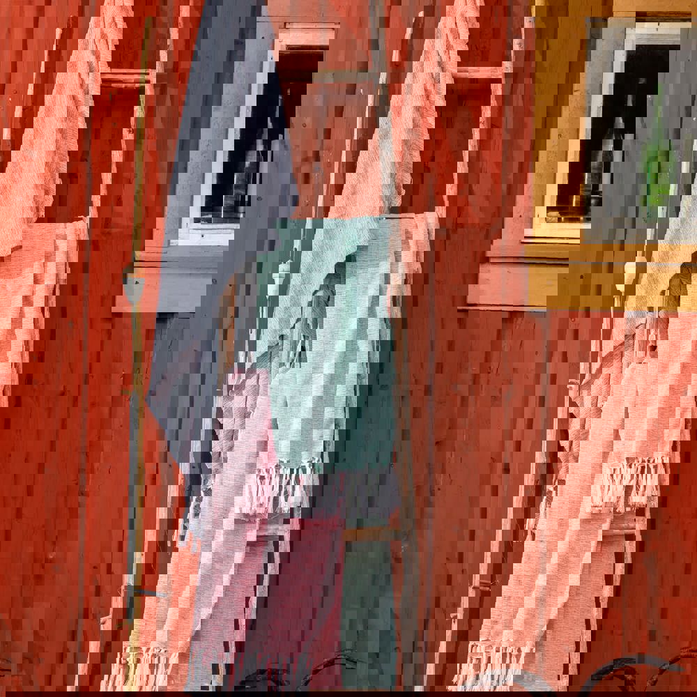Een prachtige hammamdoek met franjes, gemaakt van 70% gerecycled katoen. De gekleurde draden zijn gemengd met wit om een gevlekte indruk te geven.