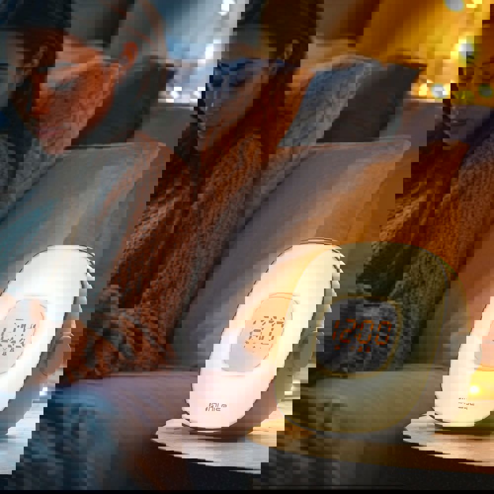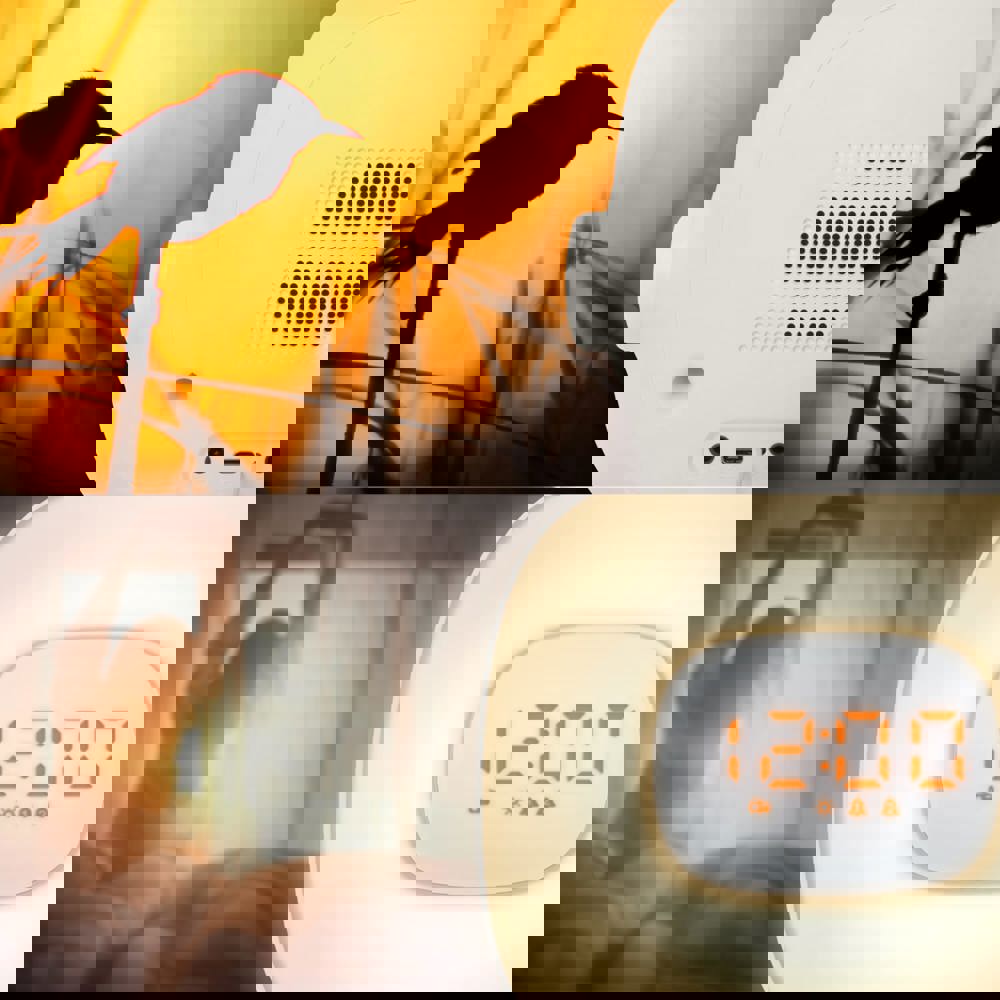 Heb je wel eens moeite om wakker te worden? Of om ontspannen in slaap te vallen? De Muse Wake-up light helpt je te ontspannen, goed te slapen en energiek wakker te worden. Met de wekkerfunctie wordt het licht geleidelijk sterker voor je wektijd; je wordt op een natuurlijke manier wakker. De wekker helpt je ook om ontspannen in slaap te vallen. De wekker zorgt ervoor dat de lichtintensiteit geleidelijk afneemt. De Muse Wake-Up Light is uitgerust met een FM-radio, zodat je wakker kunt worden met je favoriete radiozender. Kies dan bij het instellen van de wekkerfunctie voor FM-radio in plaats van natuurgeluiden. Met de USB-C aansluiting kun je gemakkelijk je smartphone - of ander gewenst apparaat - opladen. Geleverd met stekker (plat) en de mogelijkheid voor een back-up batterij (batterijen niet meegeleverd).