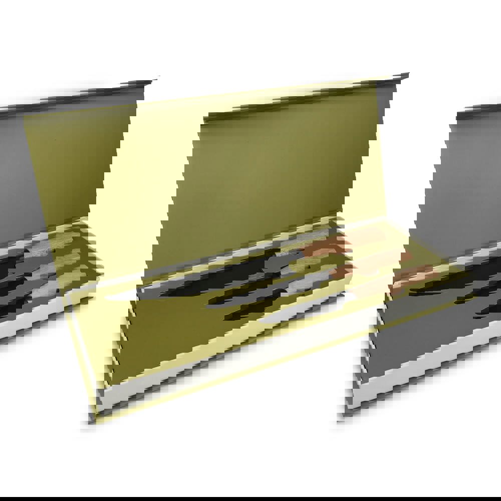 De InSideOut Ravn Essential messenset combineert elegantie en functionaliteit. Deze set bevat een schilmesje (12 cm), universeelmes (23,5 cm) en koksmes (32 cm) en is een stijlvolle toevoeging aan elke keuken. Met opvallende zwarte lemmeten en strakke FSC-gecertificeerde beech houten handgrepen, biedt de set een moderne uitstraling. Zowel de handgrepen als lemmeten kunnen worden voorzien van een lasergravure. Verpakt in een luxe geschenkdoos, perfect als cadeau of voor eigen gebruik.