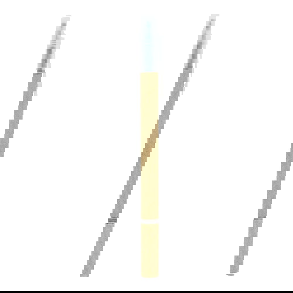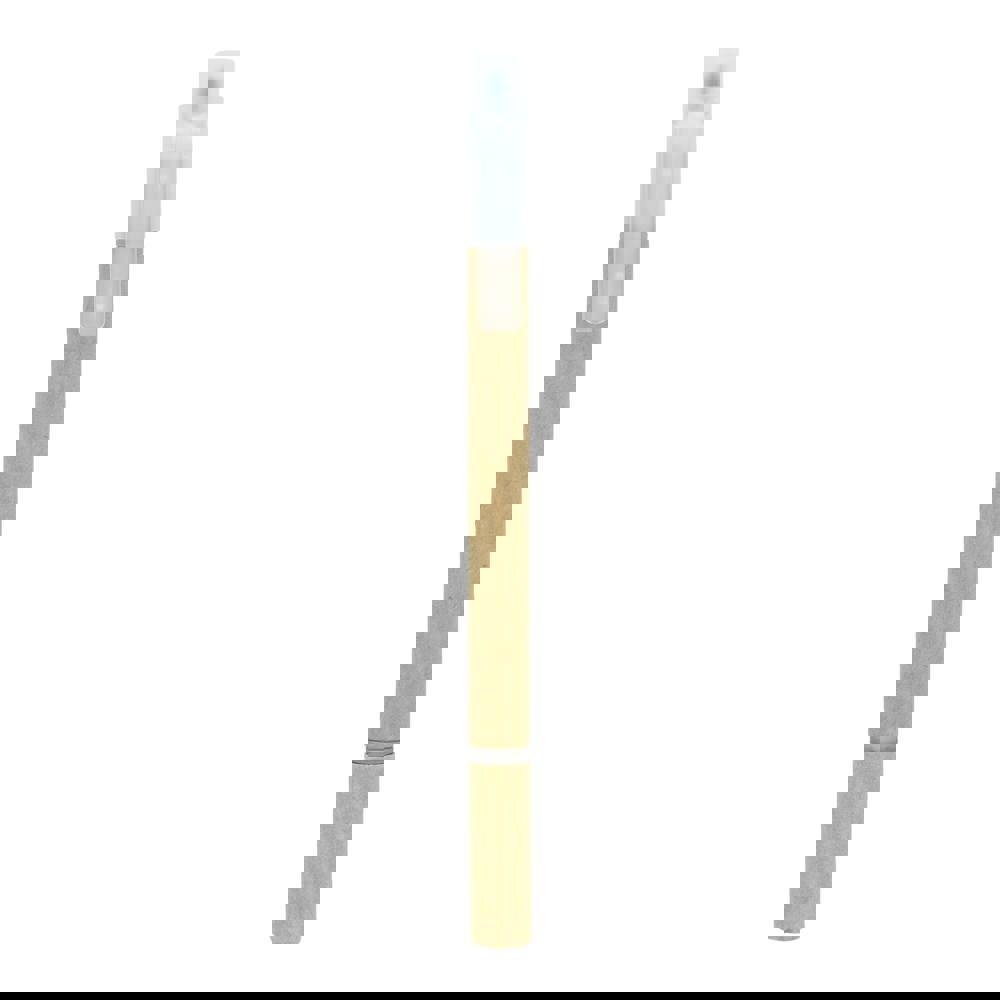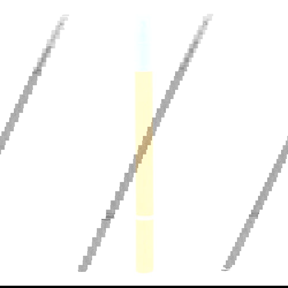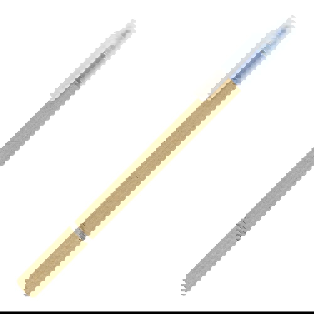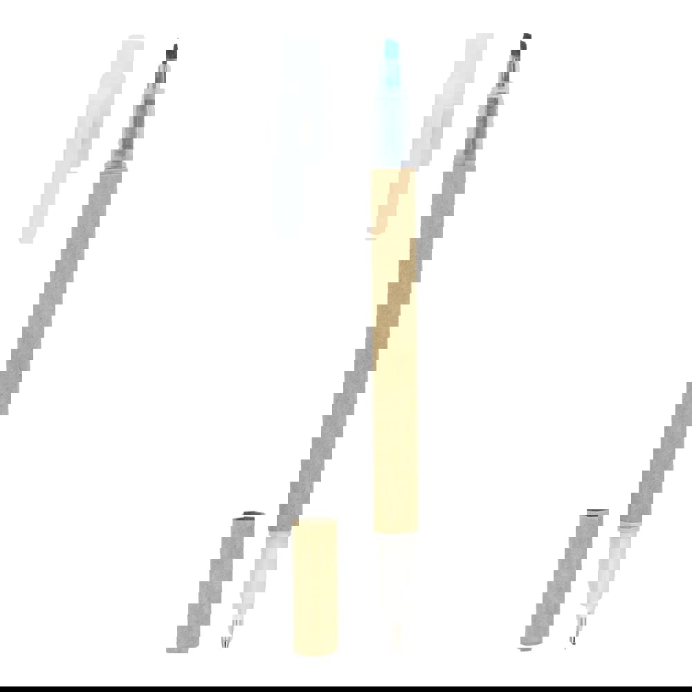 Papieren markeerstift in combinatie met een balpen. De markeerstift is verkrijgbaar in verschillende schrijfkleuren en de balpen heeft een blauwe schrijfvulling.