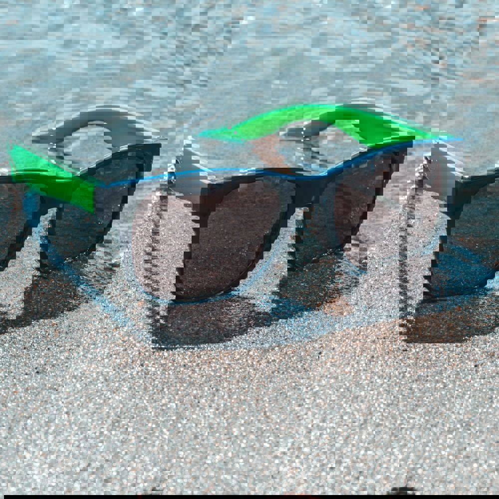 Vrolijk en modieuze zonnebril met gekleurde pootjes en UV400 filter.