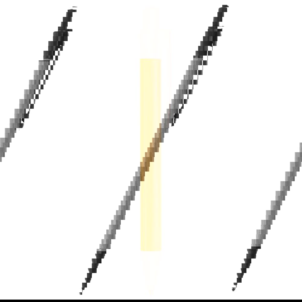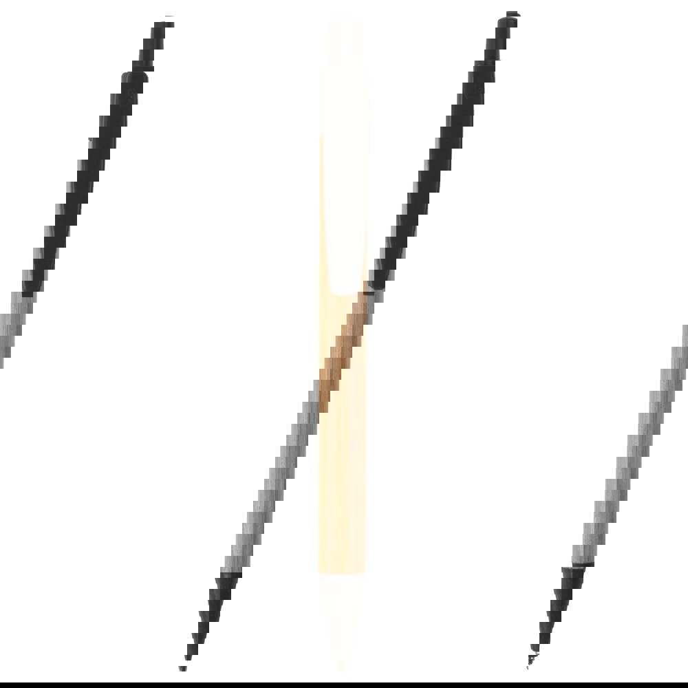 Balpen van bamboe materiaal met een clip, drukker en punt gemaakt van tarwestro. Bevat een kunststof blauwschrijvende X20 vulling.