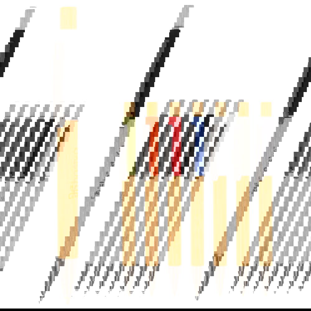 Maak kennis met 'Madrid', onze elegante aluminium pen met metalen clip, houten barrel en drukker, die een vleugje natuur toevoegt aan je schrijfervaring. Met blauwschrijvende vulling.