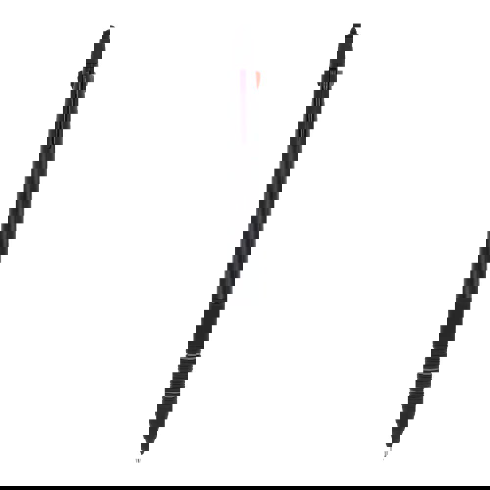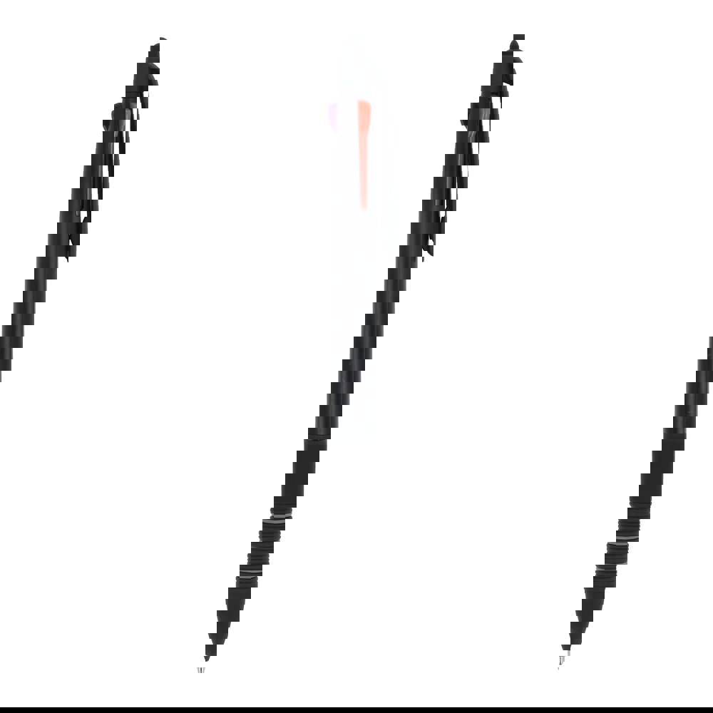 Driekleurige metallic balpen met stylus en ergonomische grip. De schrijfkleuren zijn zwart, blauw en rood.
