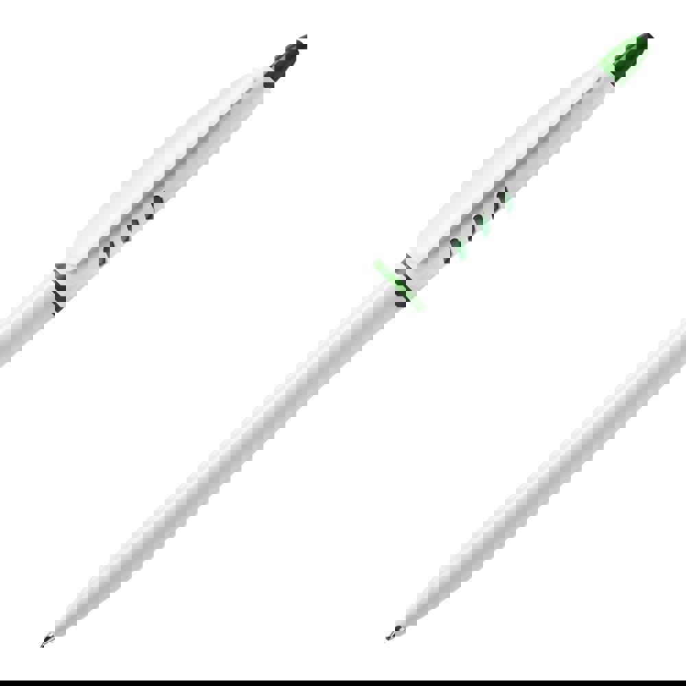 Moderne Toppoint balpen. Unieke vormgeving met zilveren onderdelen en mat, metalen punt. Gekleurde grip en tussenstuk.