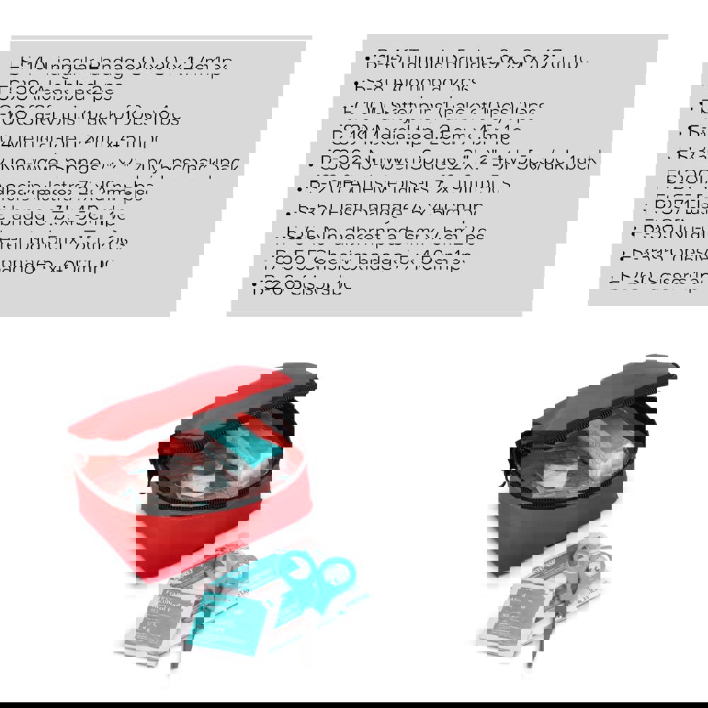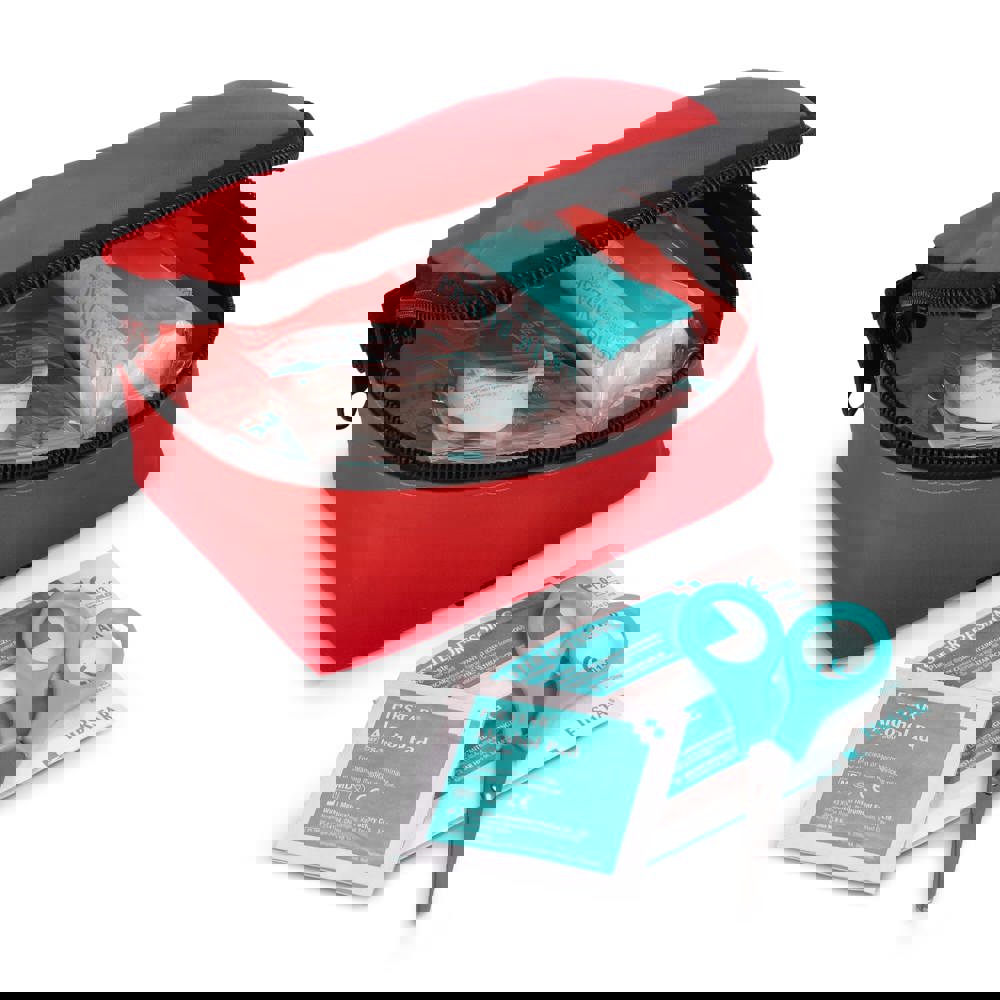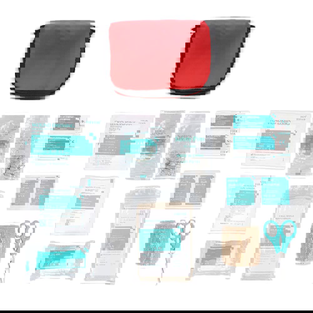 Deze EHBO set wordt geleverd in een nylon etui met klittenband bevestigings banden aan de onderzijde, zodat hij bijvoorbeeld aan een fietsstuur kan worden bevestigd of om de pols gedragen kan worden. Voldoet aan Europese normen. Ideaal voor fietsen, wandelen en outdoor-activiteiten. Inhoud: 1 × driekantverband 90 × 90 × 127 cm, 2 × alcoholpads, 1 × verpakking van 10 veiligheidsspelden, 1 × medische tape 1.25 cm × 4.5 m, 1 × pack van 5 non-woven sponzen 2"" × 2"" 4-laags, 5 × pleisters 72 × 19 mm, 1 × elastisch verband 7.5 × 450 cm, 2 × non-adherente pads 5 × 7.5 cm, 1 × cohesief verband 5 × 450 cm, 1 × schaar, 1 × pincet.