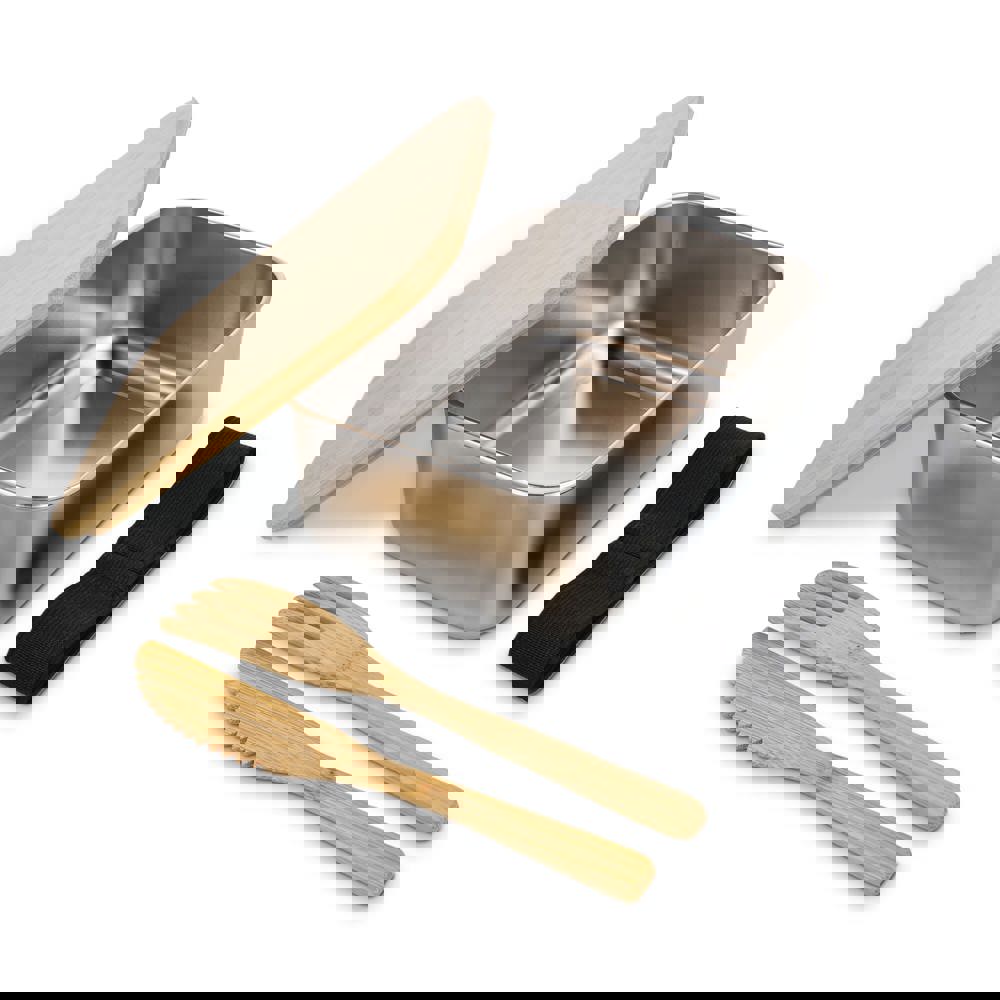 RVS lunchbox met bamboe deksel. Afgesloten met een elastische band waarin je ook de bamboo mes en vork bevestigd. Individueel verpakt in een geschenkdoos.