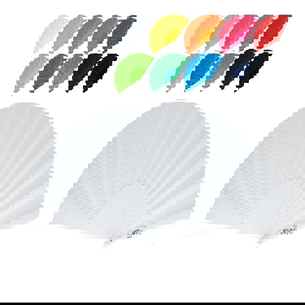 Waaier van kunststof en polyester. Verkrijgbaar in verschillende felle kleuren, ideaal voor buiten evenementen en hete zomerdagen.