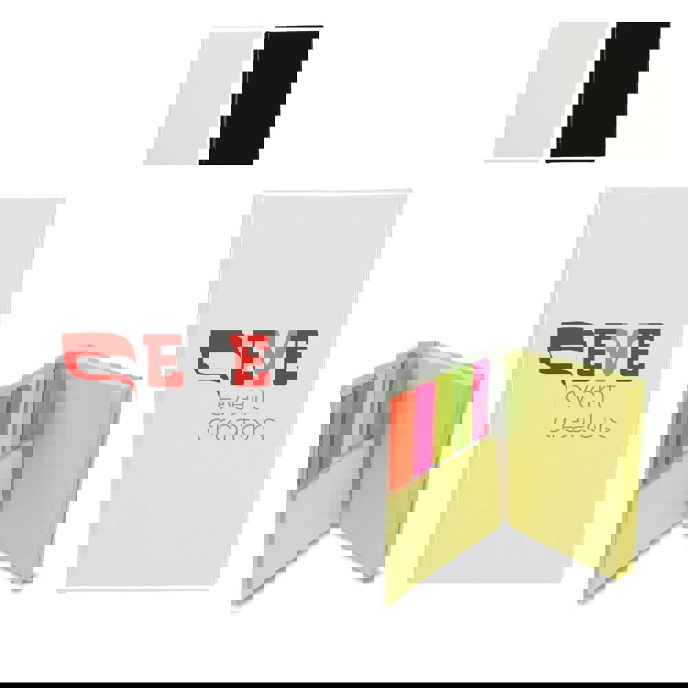 Klein notitieboekje met 100 zelfklevende grote memoblaadjes (100x75mm), 25 kleine zelfklevende memoblaadjes (50x75mm) en vijf 25 kleurige opmerkingenblaadjes. Groot drukoppervlak op de voor- en achterzijde.
