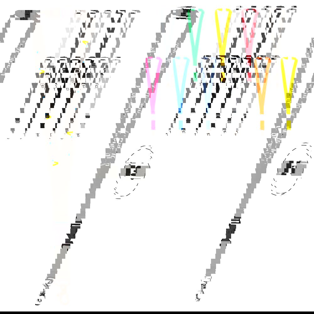 Polyester lanyard met afneembare kunststof gesp, metalen haak en veiligheidssluiting.