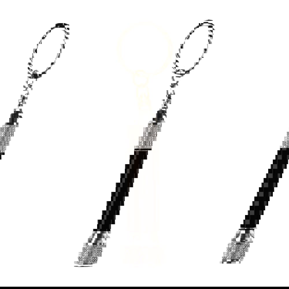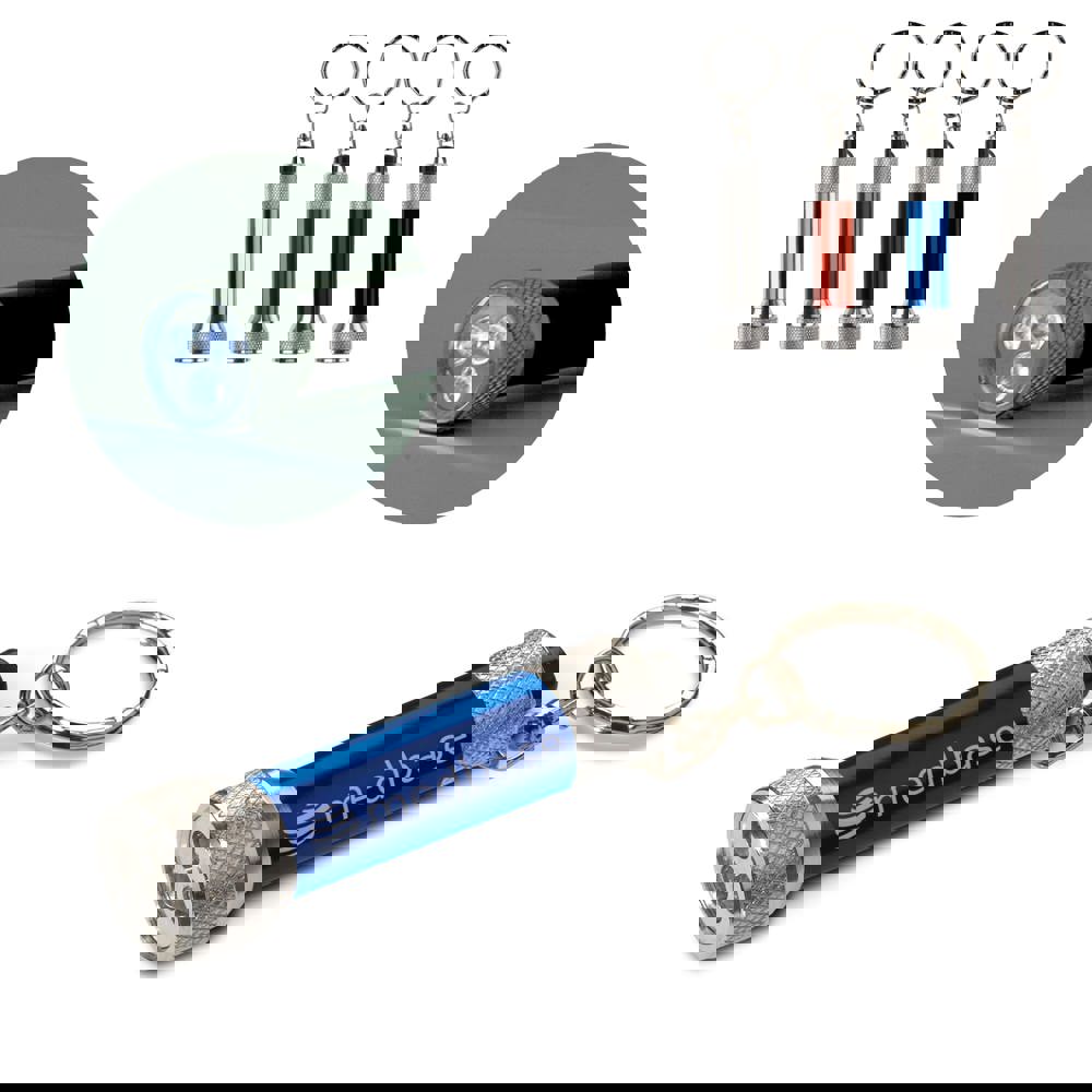 Metalen sleutelhanger met klein zaklampje. Drie kleine LED lampjes zorgen voor een hoge lichtopbrengst. Inclusief batterijen.
