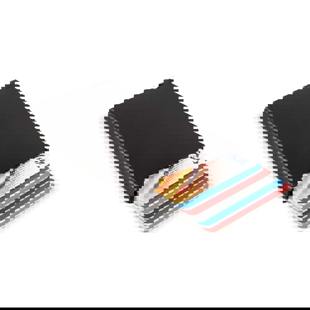 Uniek design aluminium kaarthouder om (bank)passen te beschermen tegen RFID skimming. Druk op de knop en zes kaarten (vier met verdikte letters) komen getrapt uit de houder.