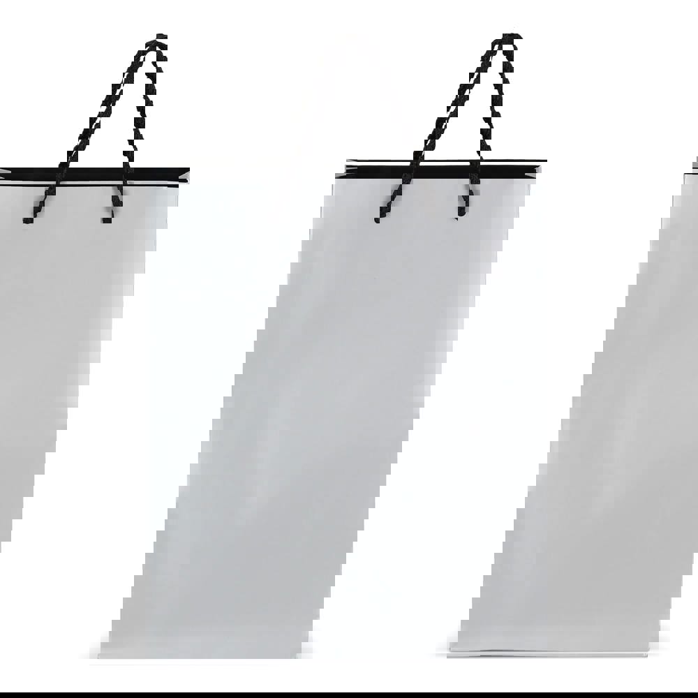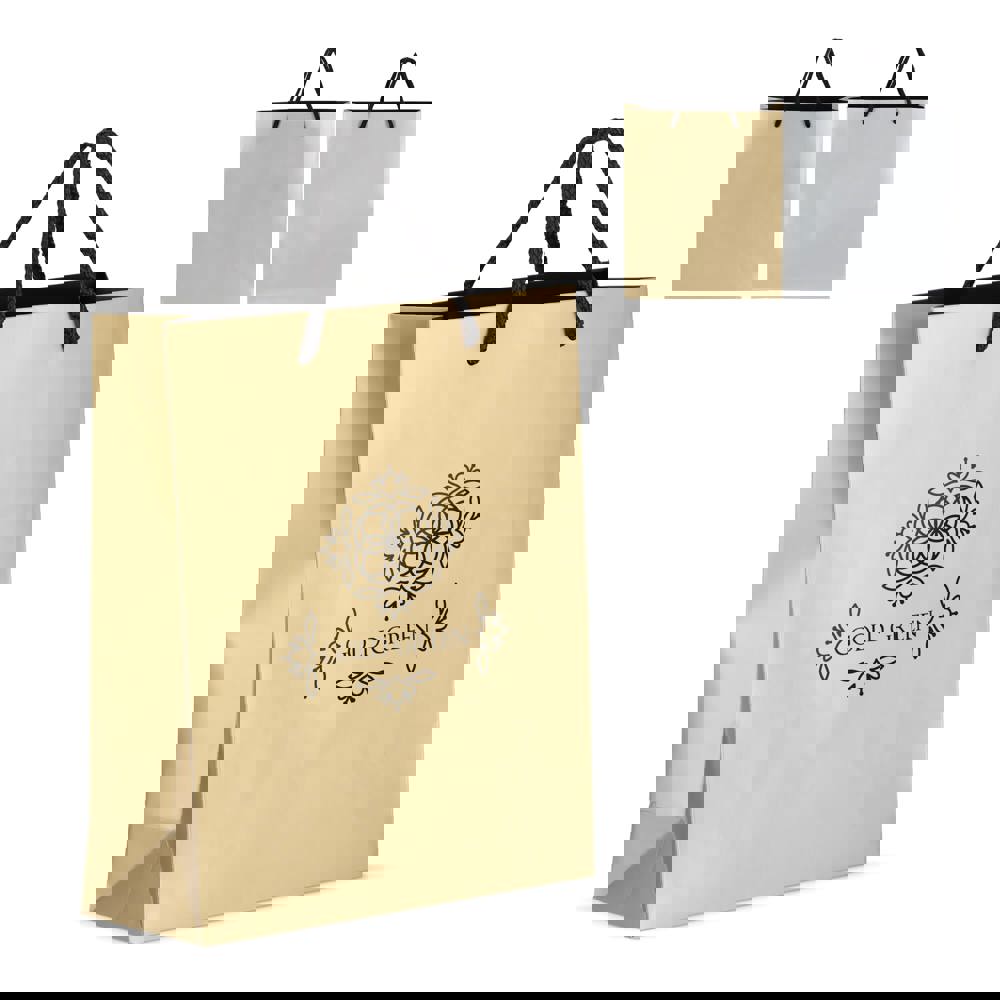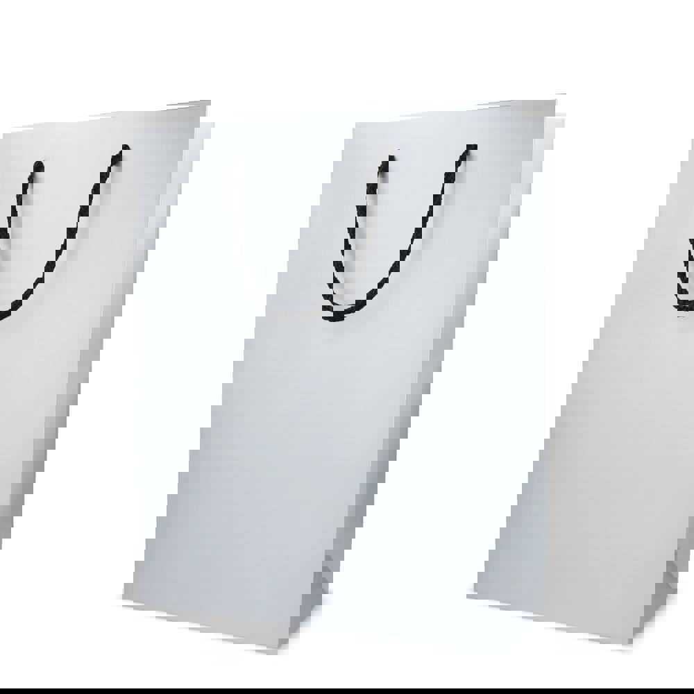 Elegante cadeautas gemaakt van papier, met 5 mm dikke handvatten van gerecycled polyester. Ontworpen om tot 5 kg te dragen, met een luxe uitstraling door de zwarte handvatten en een zwarte binnenafwerking. Perfect voor het presenteren van cadeaus.