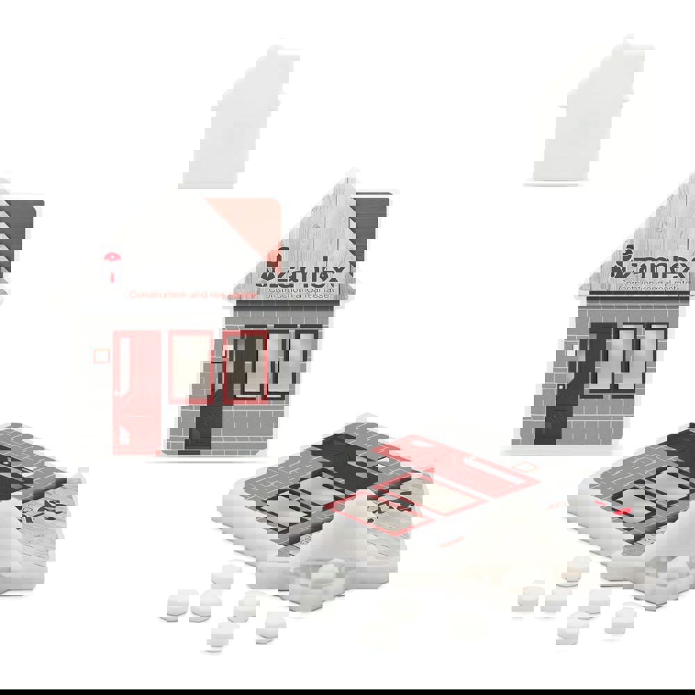 Wit pepermuntdoosje in de vorm van een huis. Opening van het doosje in de schoorsteen. Inhoud: circa zeven gram suikervrije pepermuntjes.
