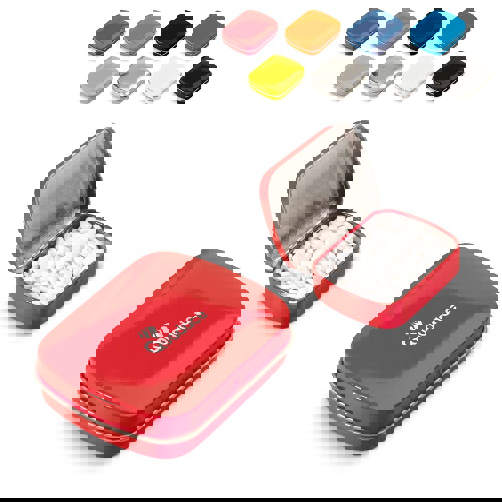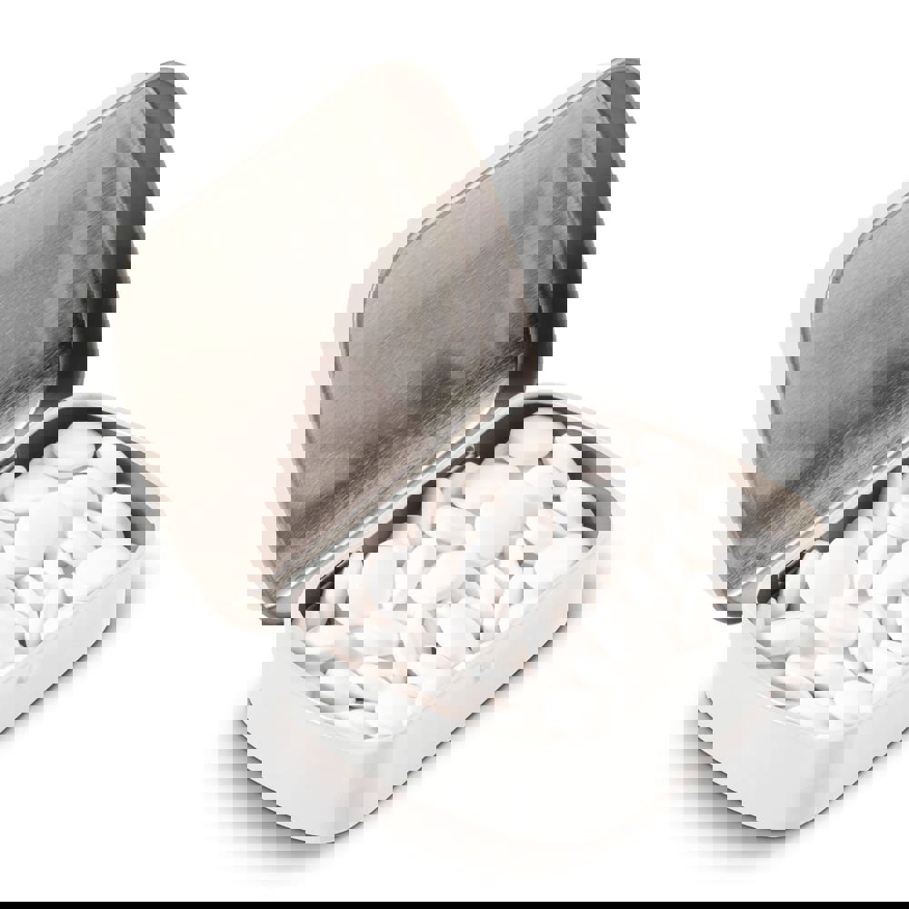 Scharnieren pepermuntblikje. Gevuld met 23 gram Europese pepermunt. Altijd verfrissende pepermuntjes bij de hand. Niet suikervrij.
