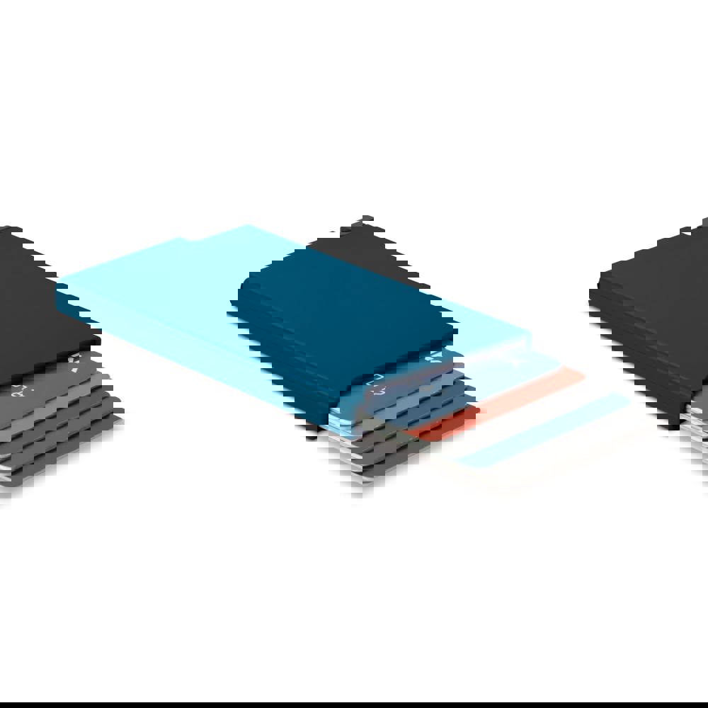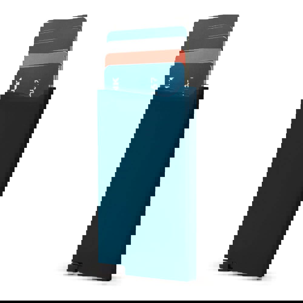 Uniek design kunststof kaarthouder om (bank)passen te beschermen tegen RFID skimming. Druk op de knop en tot vijf kaarten komen getrapt uit de houder.