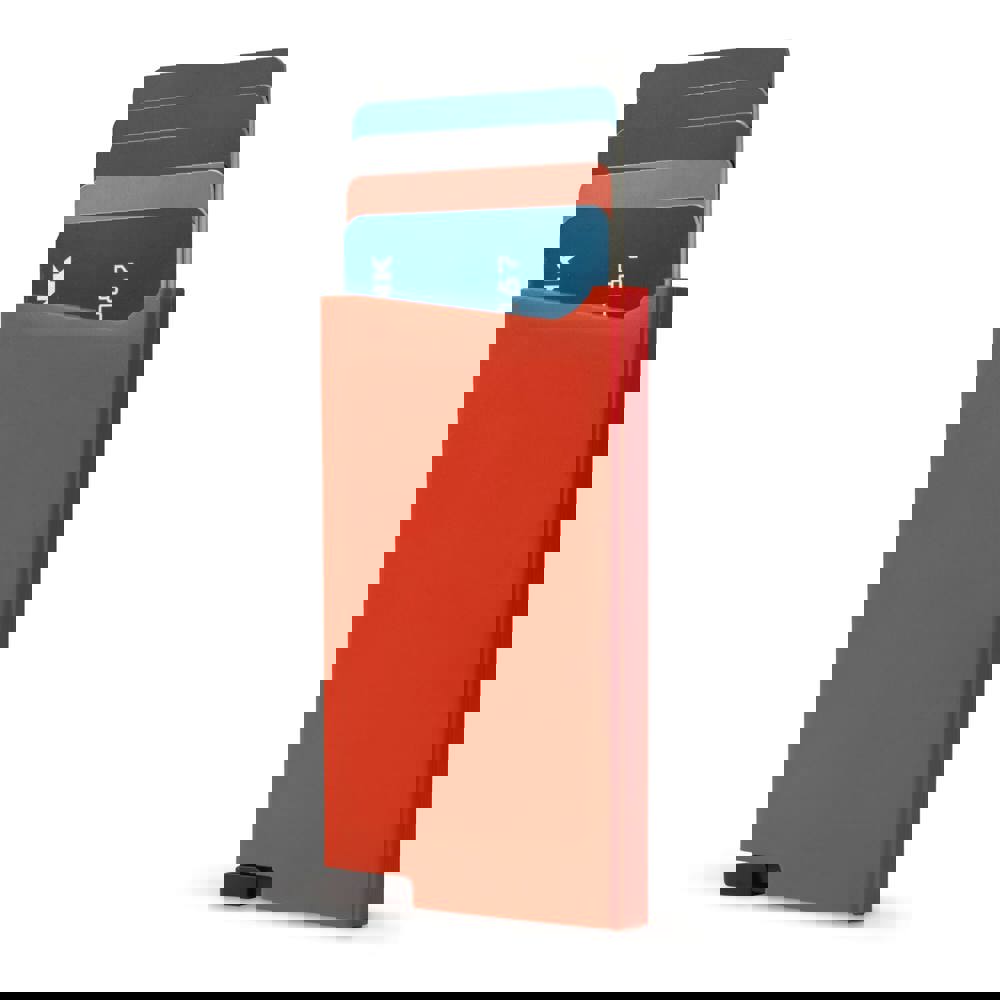 Uniek design kunststof kaarthouder om (bank)passen te beschermen tegen RFID skimming. Druk op de knop en tot vijf kaarten komen getrapt uit de houder.