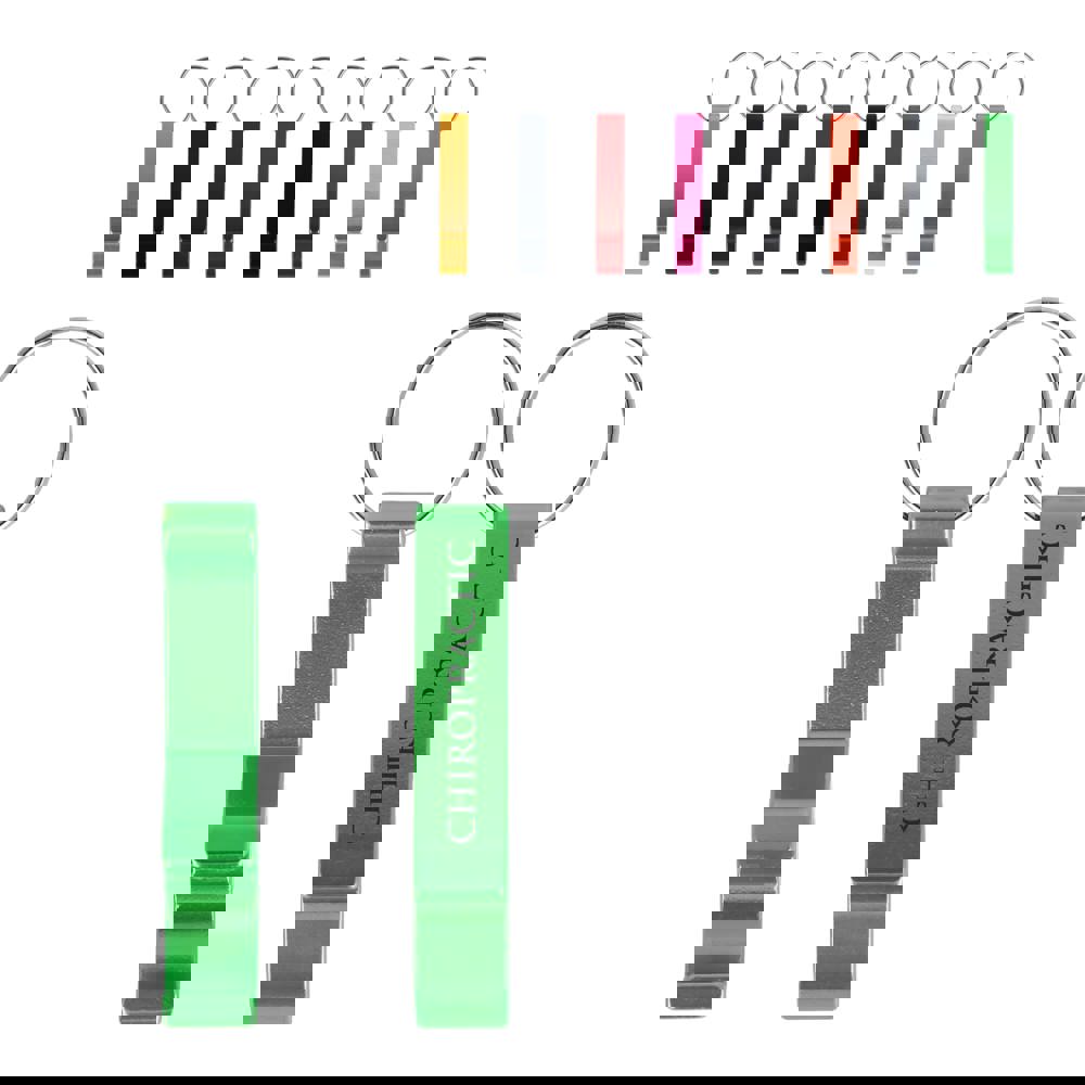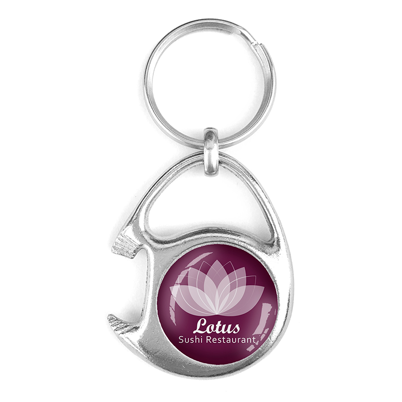 Aluminium 3-in-1 sleutelhanger met flesopener, telefoonstandaard en afneembare winkelwagenmunt, geschikt voor de meeste winkelwagens in West-Europa. Een compact en praktisch promotieartikel.