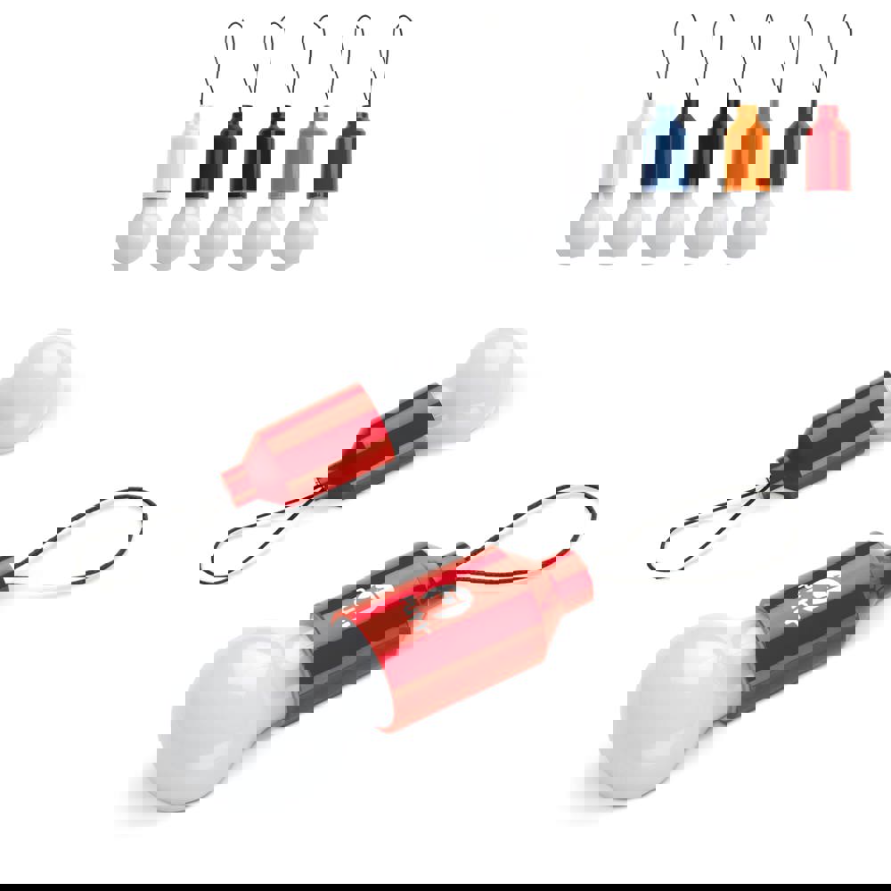 Kleine sleutelhanger in de vorm van een gloeilamp. Gaat eenvoudig aan door aan het gloeilampje te trekken. Het lampje bevat één LED die tien lumen levert en is gemaakt van ABS. Batterijen meegeleverd.