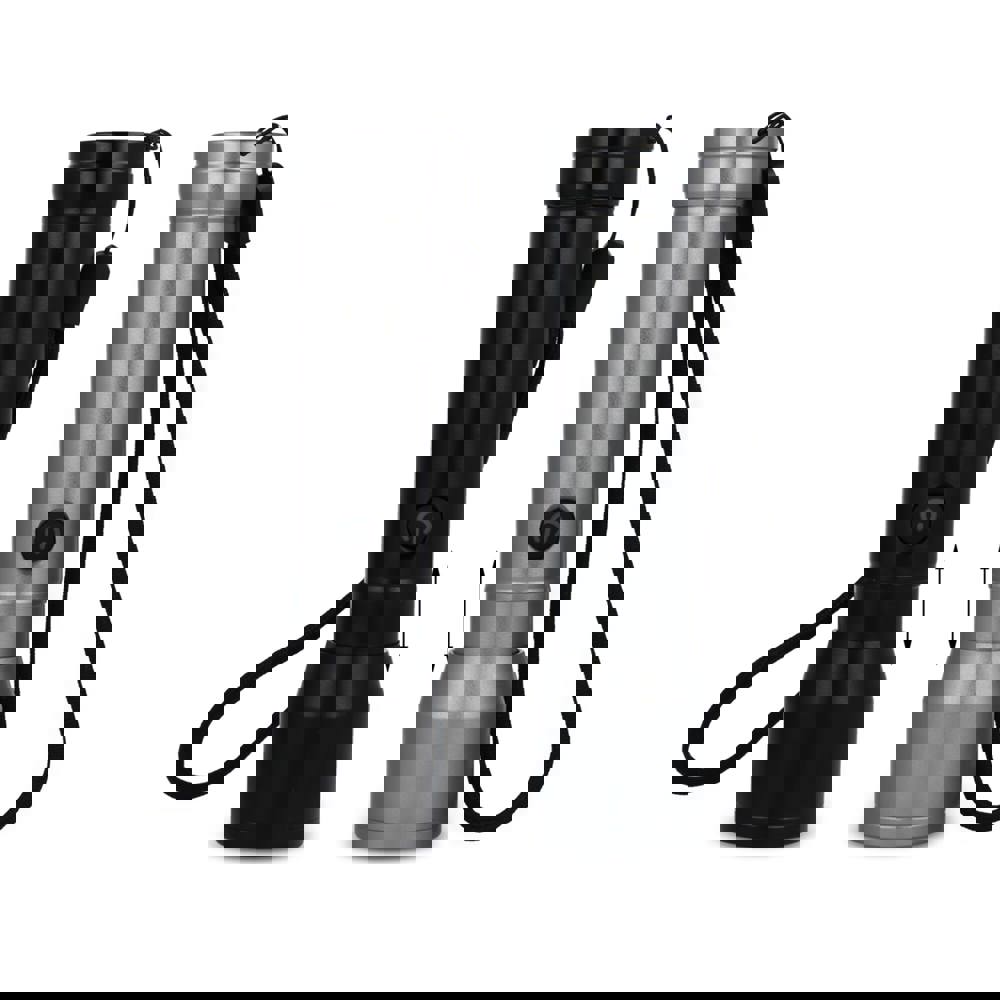 Oplaadbare zaklamp met een 1200mAh batterij en 5W LED-licht dat 200lm helderheid geeft. Met handriem, meerdere lichtstanden (hoog, laag en flits) en zoomfunctie. Gemaakt van gerecycled aluminium en waterbestendigheid conform IPX4-rating.