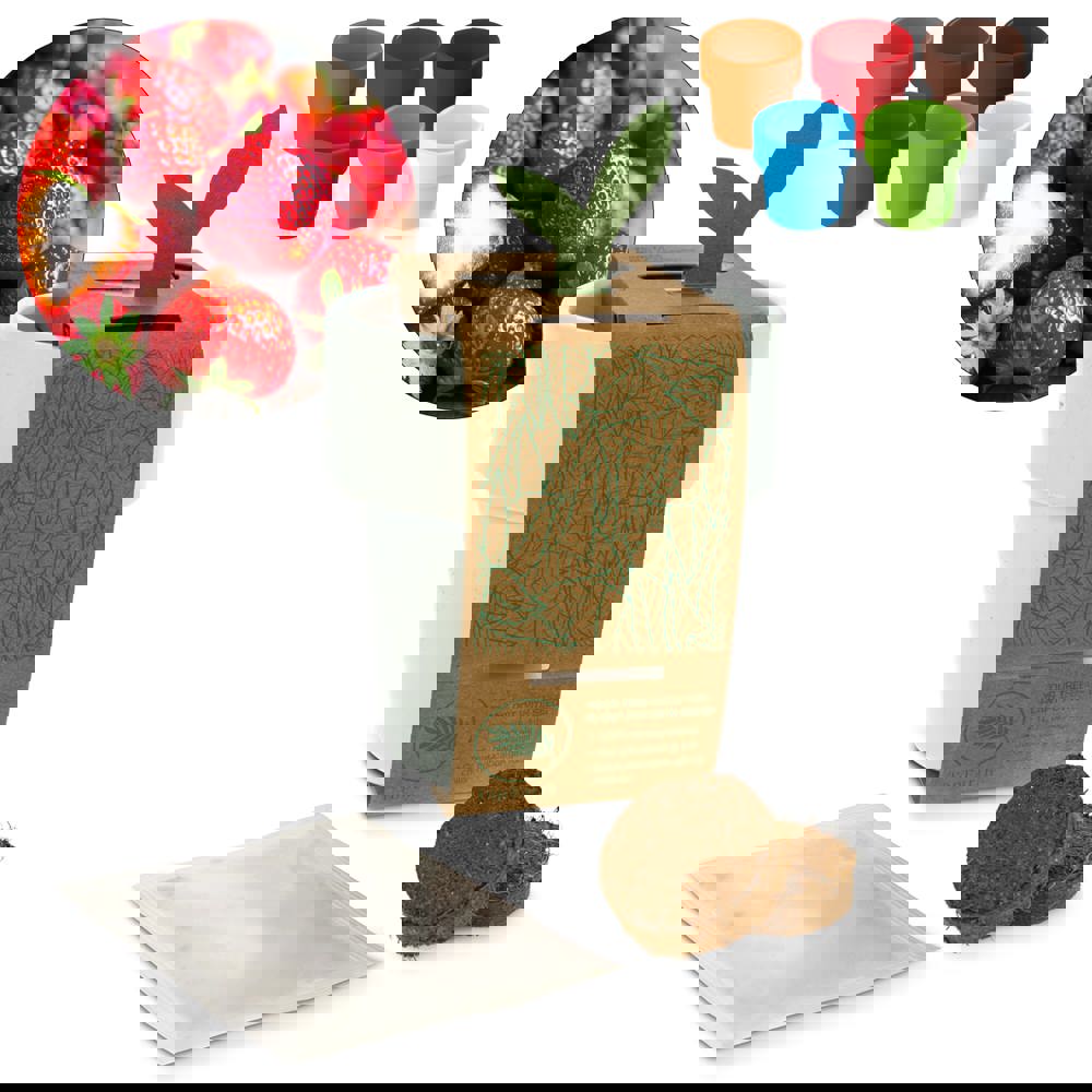 Een bloempotje met een pakje aardbeien zaadjes in meerdere vrolijk kleuren. Als het plantje groot genoeg is om deze over te zetten in de tuin, dan is de bloempot tevens ook schoon te maken en te gebruiken als koffiemok. De goed ontworpen rand zorgt voor een dubbele wand, om te voorkomen dat de hand verbrand bij het drinken.