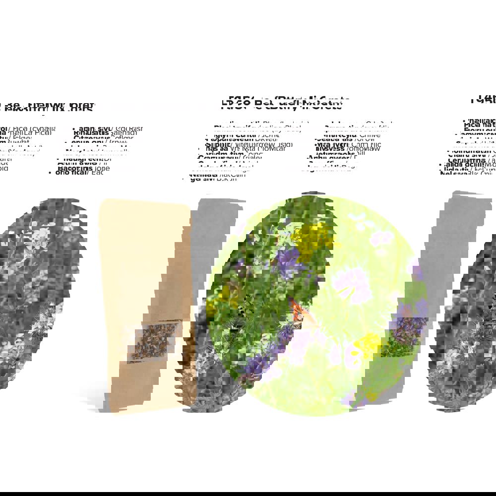 Kraft papieren zak met 4 gram vlinder- en bijenbloemenzaden geschikt voor 2 m² bloemen. Een echt duurzaam cadeau.