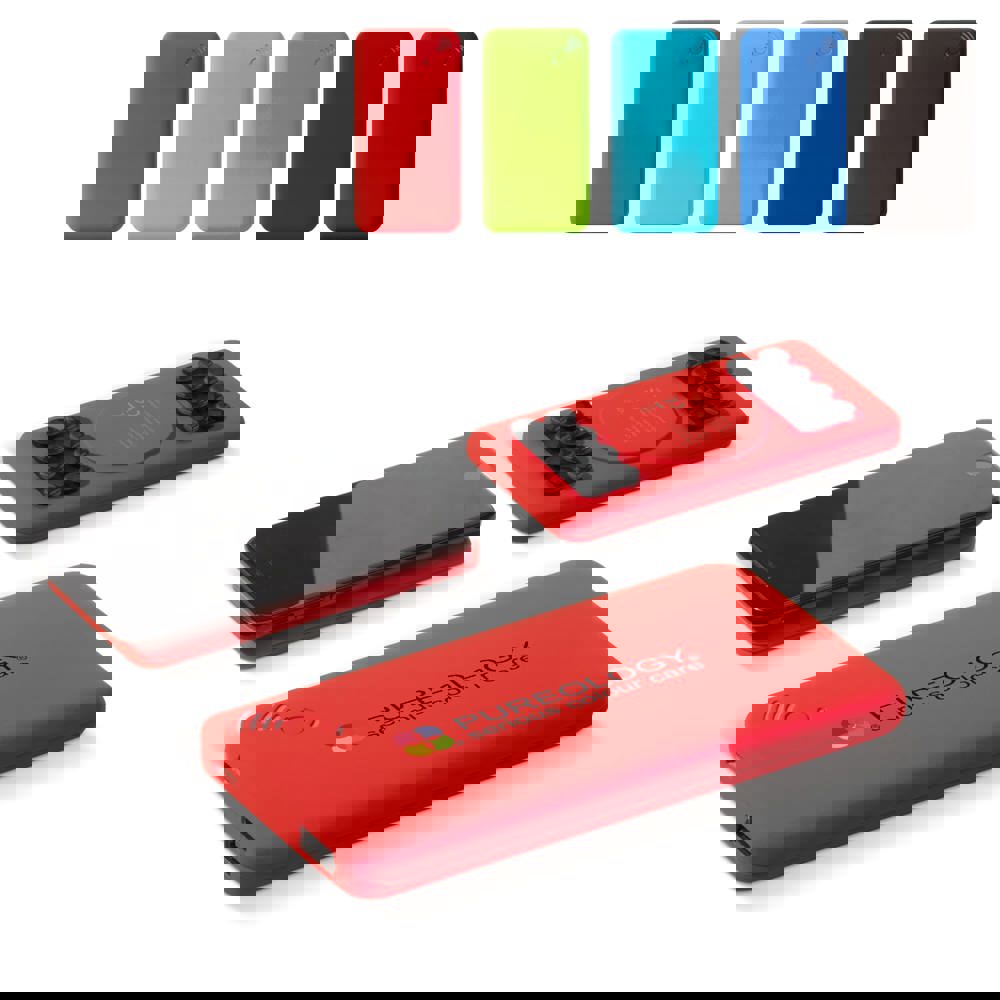 Platte draadloze powerbank met rubberized finish en een capaciteit van 4.000mAh. Door de zuignappen op de powerbank blijft de telefoon verbonden met het draadloos laadgebied. Er kan ook gebruik worden gemaakt van de bijgeleverde kabel om de telefoon op te laden.