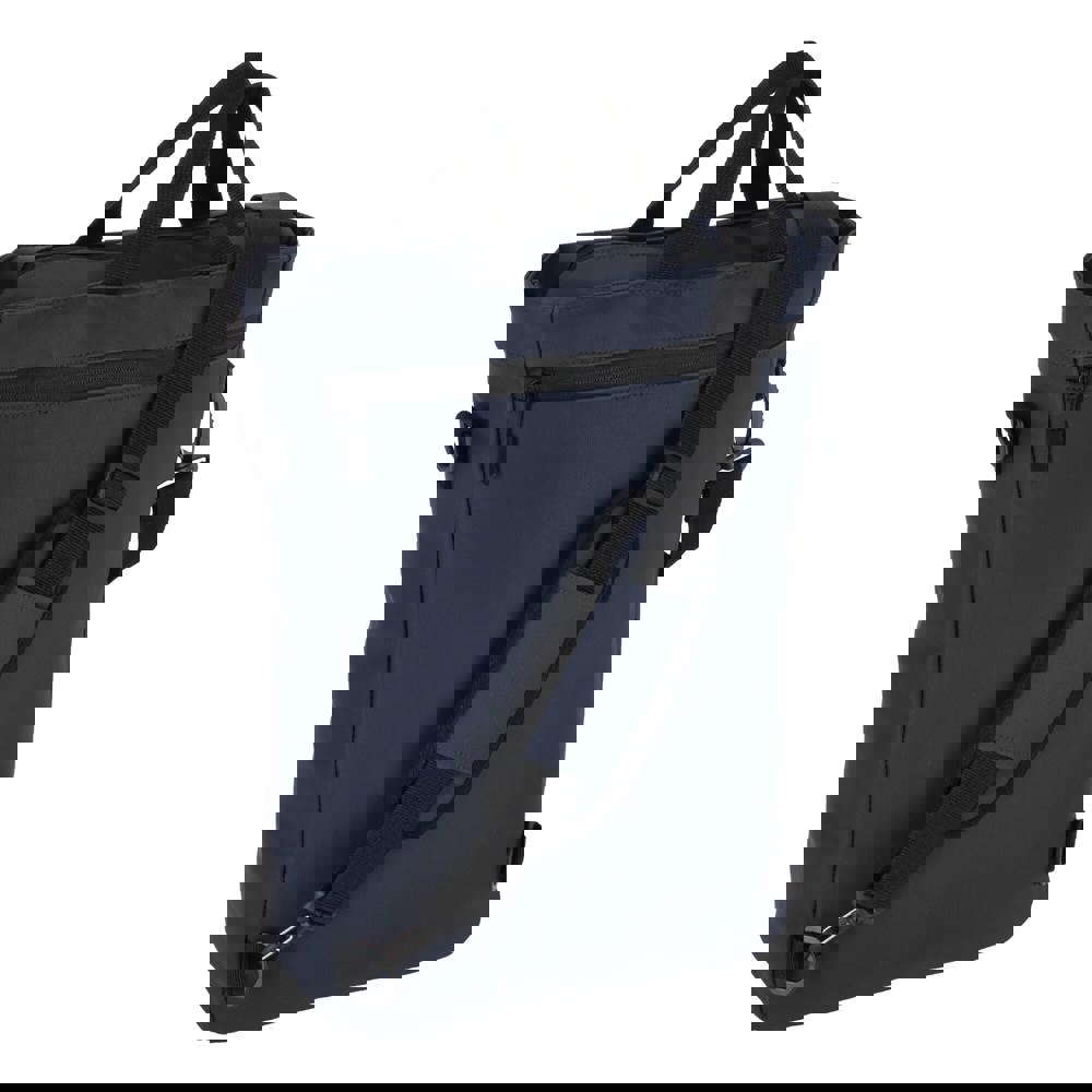 Convertible laptoprugzak van PU-materiaal met 210D voering, geschikt voor de meeste 15,6"" laptops. Te dragen als rugzak met dubbele schouderbanden die kunnen worden weggewerkt, of over één schouder met de meegeleverde enkele draagriem. Voorzien van een groot voorvak met rits en een georganiseerd interieur met gewatteerd laptopvak en twee kleine vakken.