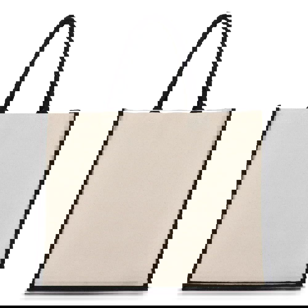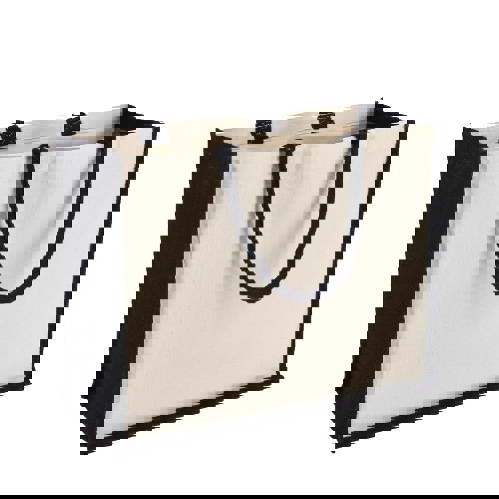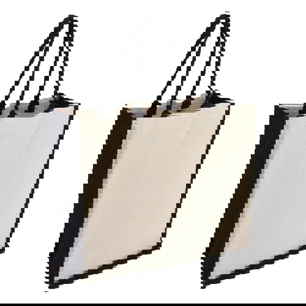 Stijlvolle tas met katoenen canvas voor- en achterpanelen en jute zijkanten en bodem – alles 320gsm. Afgewerkt met katoenen handvatten en zijkanten in accentkleuren voor een opvallende uitstraling. Oeko-Tex® gecertificeerd. Ideaal voor retail, events of dagelijks gebruik.