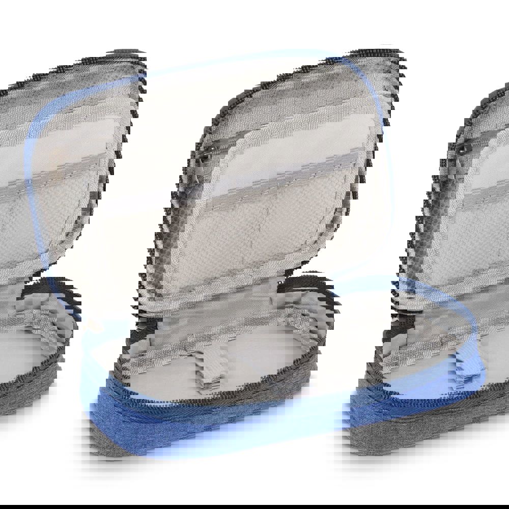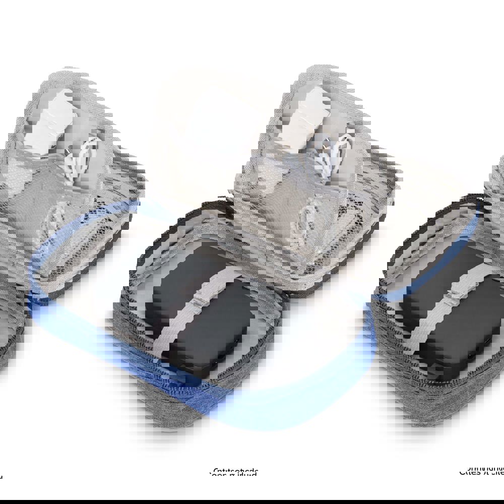 Veelzijdig organiser van 300D rPET met polsbandje voor gemakkelijk dragen. Binnenin bevindt zich een middelgroot gaasvak met ritssluiting, twee kleine open gaasvakken en een hoofdvak met een elastische klittenbandsluiting om grotere items zoals powerbanks vast te zetten. Compact en praktisch voor op reis om je powerbank of laadkabels op te bergen.