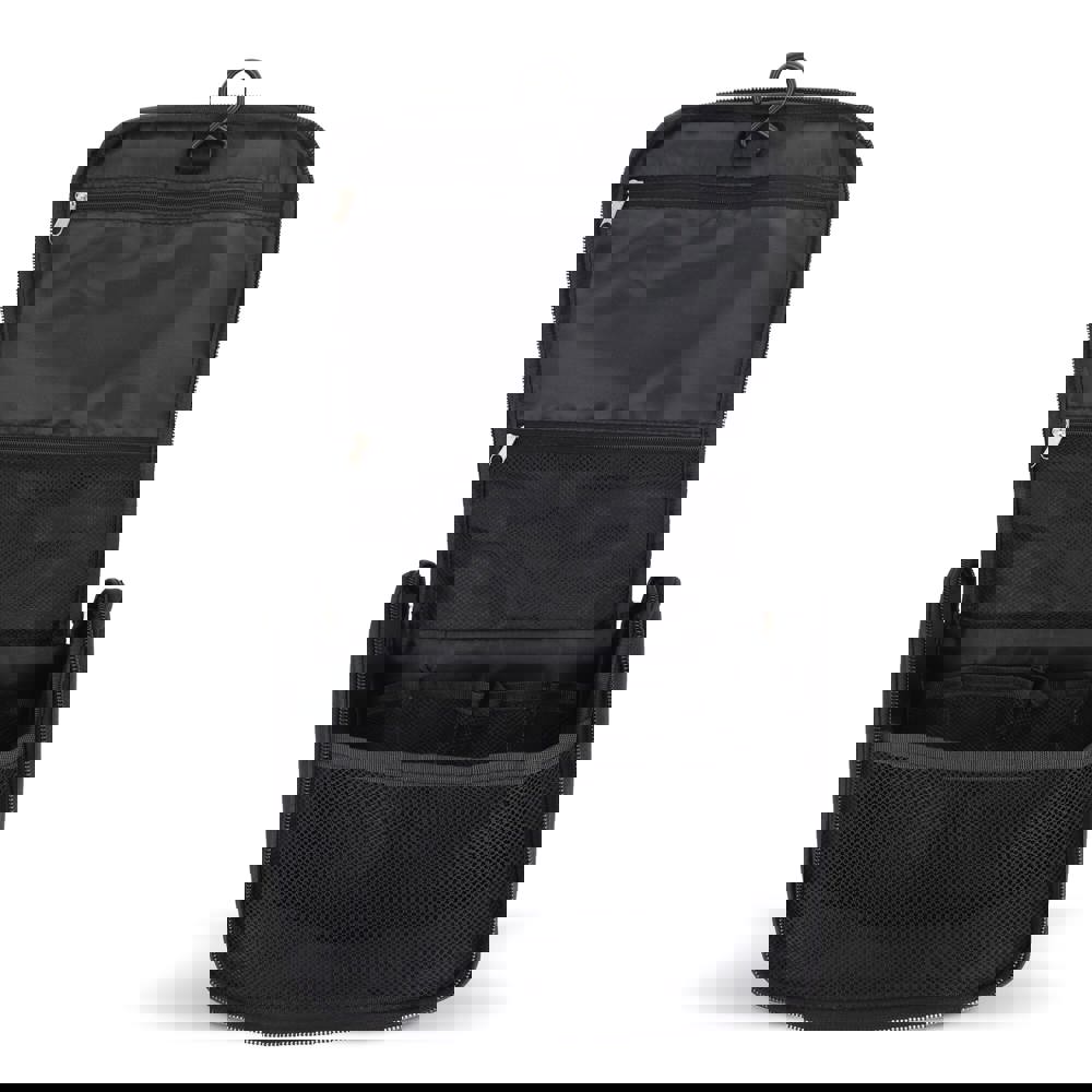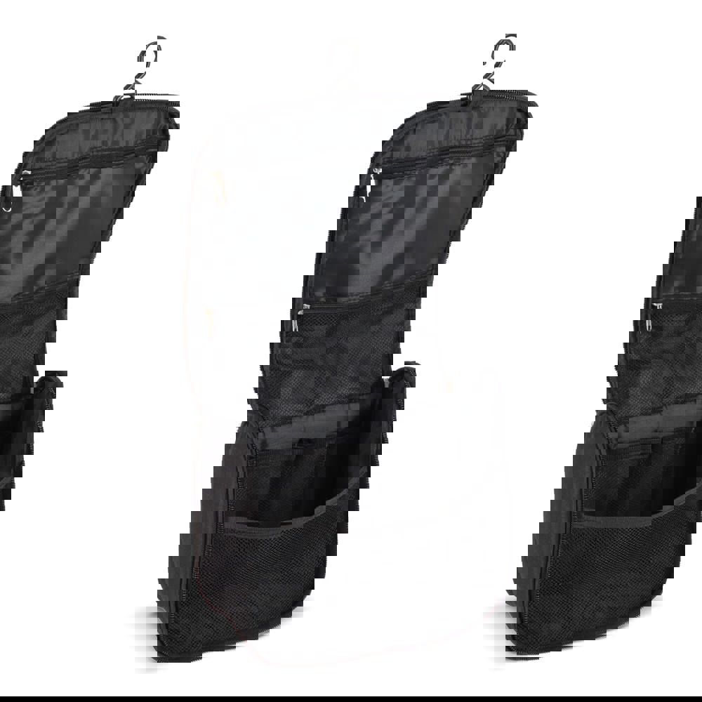 Toilettas van 300D rPET met voorvak met rits en bovenhandgreep. Binnenin een haak om op te hangen, twee ritsvakken (één van mesh), vier open mesh-vakken voor reisflesjes en een groot hoofdvak voor overige toiletartikelen. Ideaal voor georganiseerd reizen.